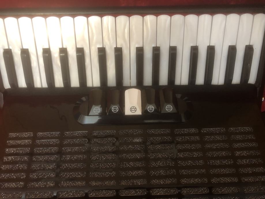 Harmonika je cijela drvena presvučena celuloidom, sa drvenim fasenima, deklo je aluminijsko presvučeno celuloidom - dakle rađena kao što su se nekada radile kvalitetne harmonike.