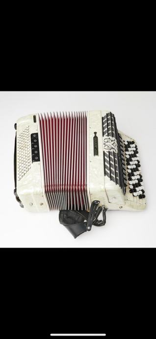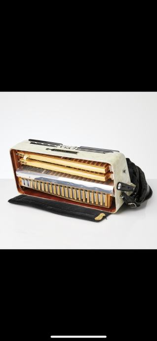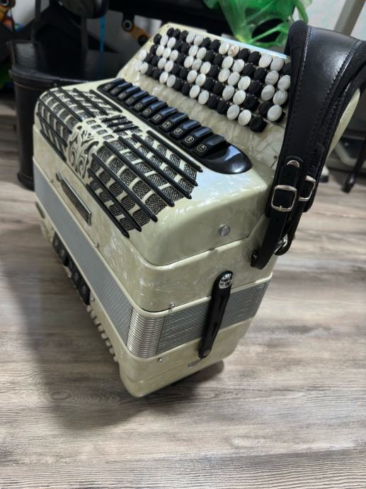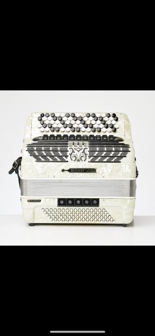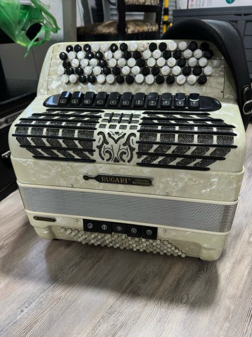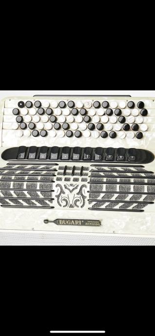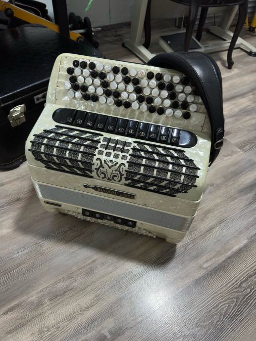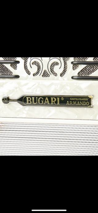 Bugari Armando 2+2 , gabarit 42x19cm , tezina 10kg, tacnije po fabrickoj specifikaciji 10.200kg, ali nema master registar sa strane tako da je i jos manje. harmonika bukvalno kao NOVA , canjoni tonovi prva klasa -harmonika extremno glasna! Harmonika ima 96 basova manja i laksa a profesionalna NE POSTOJI! Idealna za preradu na dugmetaru a moze i z smesne pare i ovako iz C u B-griff da ostane petoredna, poseduje kofer u perfektnom stanju i potpuno nove kaiseve.