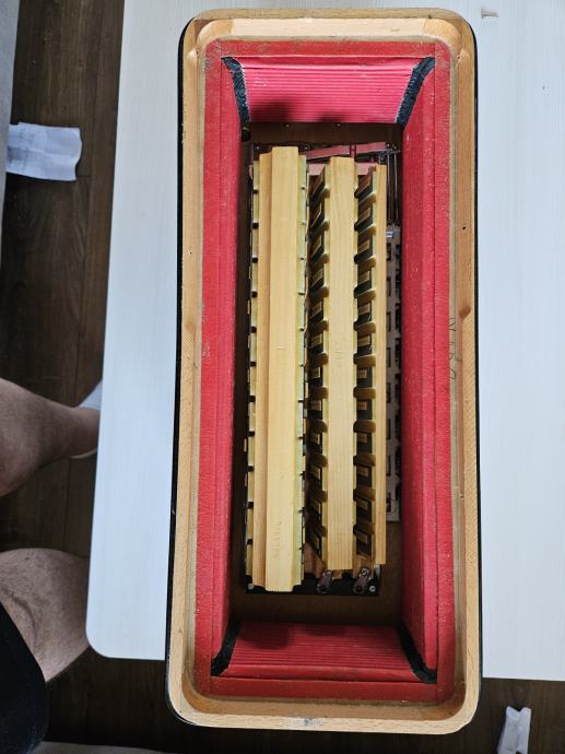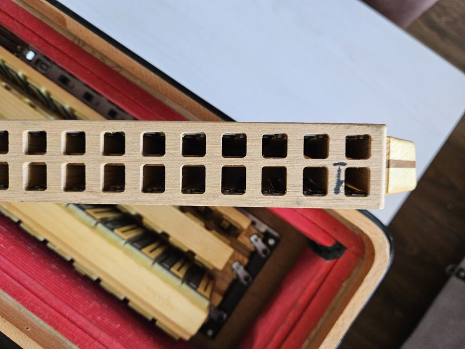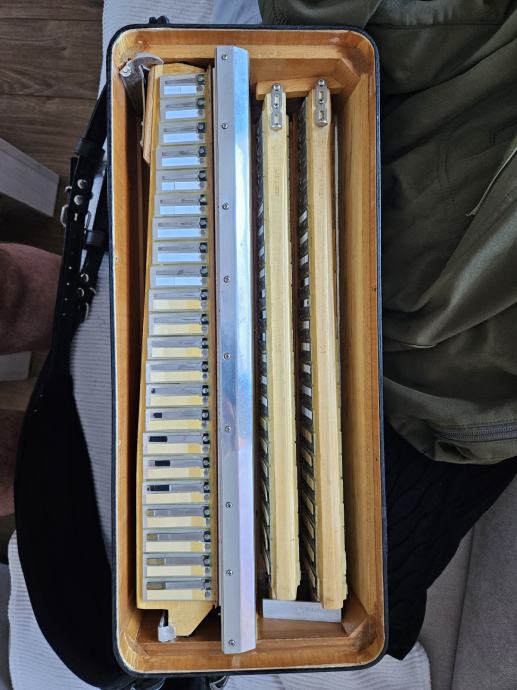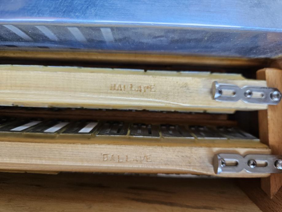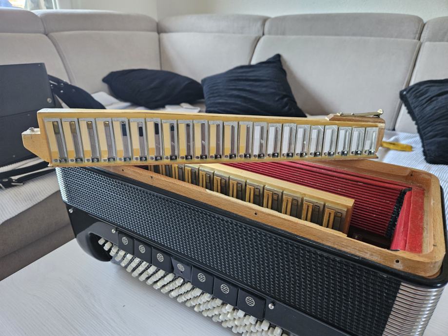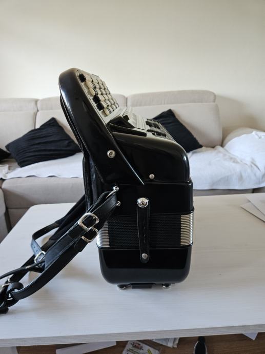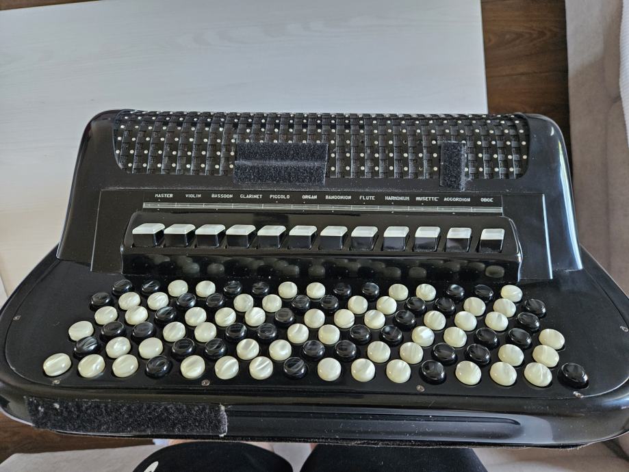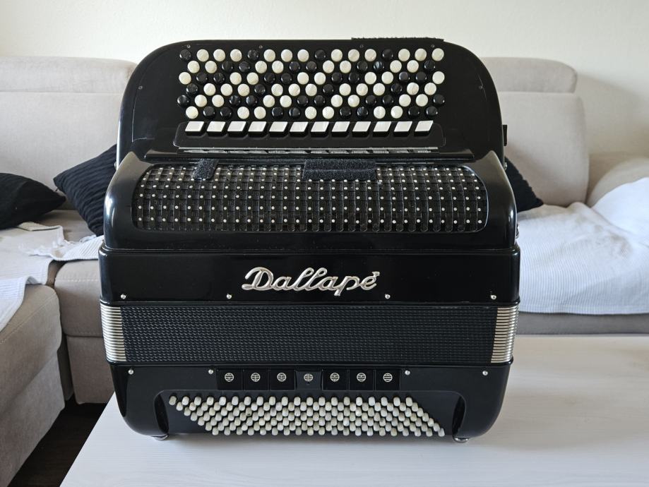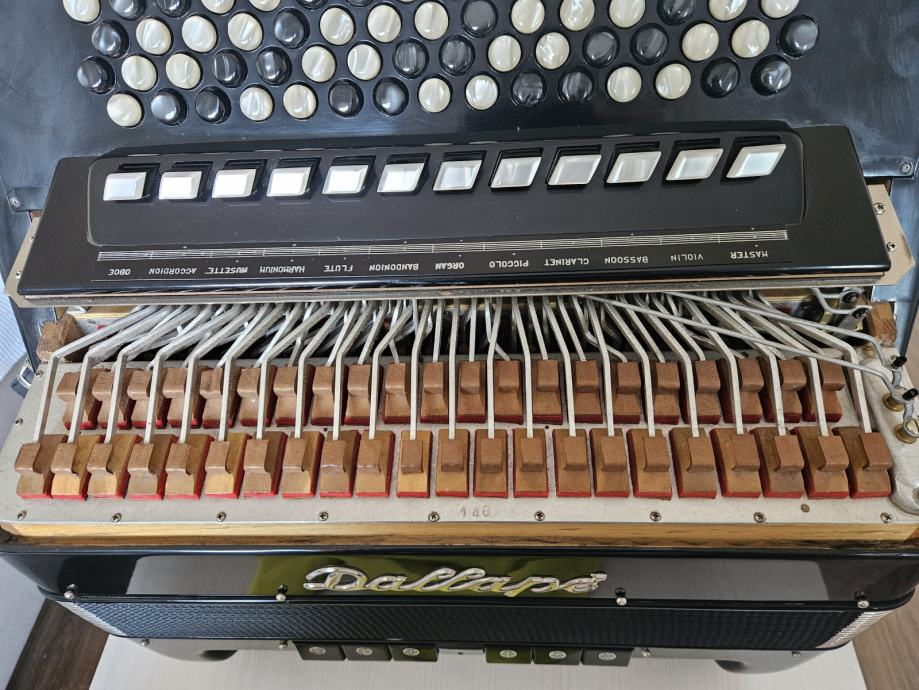 Na prodaju Dallape Supermaestro dugmetara. Harmonika je 140 basova, 2+2, dimenzija kao Sampionka. Original, Taboro tonovi, kisobranska glava, rucno kovani, zuti fasen, velike rupe na patosu i u fasenima, moderan stim. Odlicno se javlja na razglas kao i na suvo, ne gusi se. Klavijatura je kao kod svih modernijih harmonika. Napravljena je pri samom kraju rada fabrike, nema mnogo zajednickog sa starim Dallape harmonikama. Skoro je nastimovana i bez ulaganja. Odlicno izbalansirana harmonika, bas strana nije teska, tezine harmonike oko 12kg.