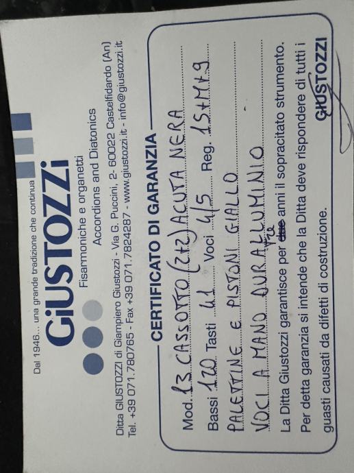 Na prodaju profesionalna klavirska harmonika Giustozzi (Castelfidardo, Italija), poznatog talijanskog proizvođača s dugom tradicijom i vrhunskom izradom.