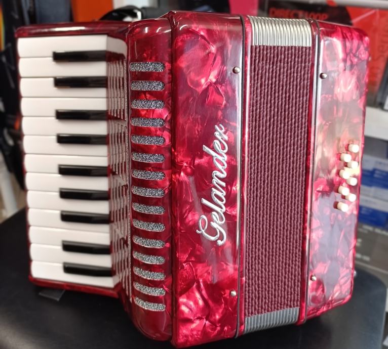 GOLDENCUP GH2000RD iz GELANDER serije harmonika ima 8 basova, a težina harmonike GOLDENCUP GH2000RD je 2,5kg. Dimenzije ove Goldencup harmonike crvene boje, su 49x41x64 cm. Sa harmonikom GOLDENCUP GH2000RD uključeni su remene i DELUXE torba.