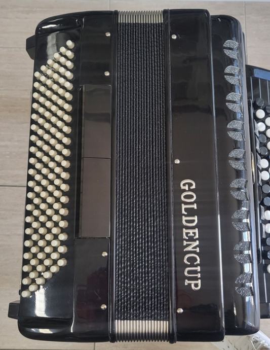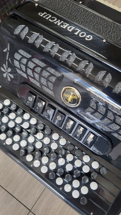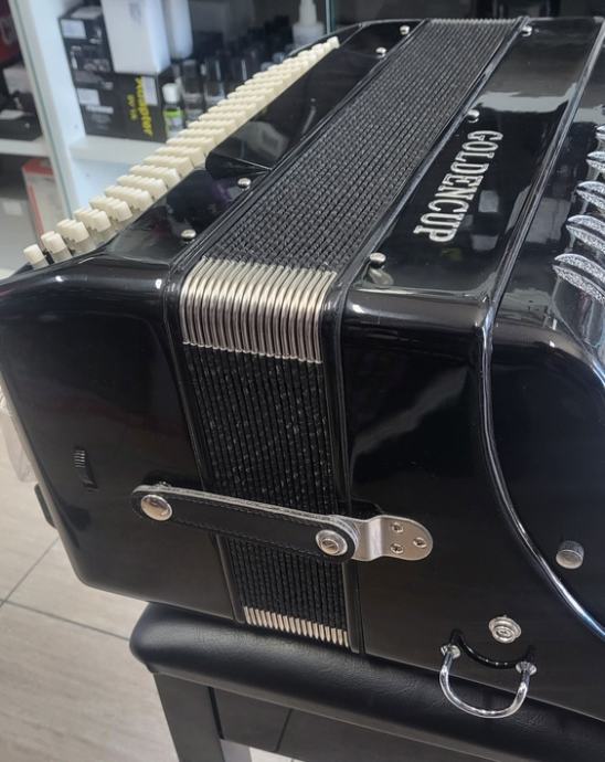 Harmonika GOLDENCUP JH5120 70K120BS dugmetara. GOLDENCUP JH5120 3-glasna harmonika sa 120 basova i 70 gumba u 5x redova, te 7+2 registra, B-grif. Sa harmonikom su uključeni remeni i DELUXE torba.