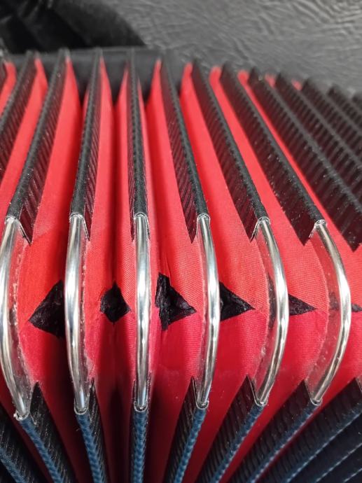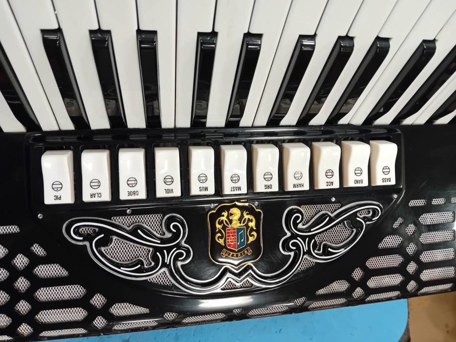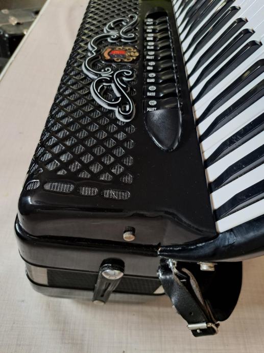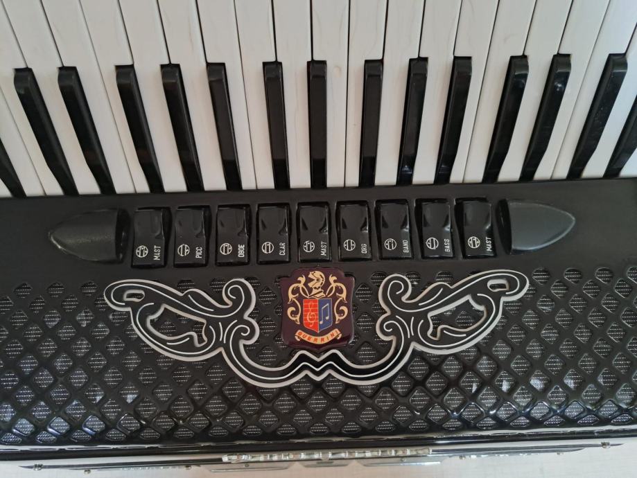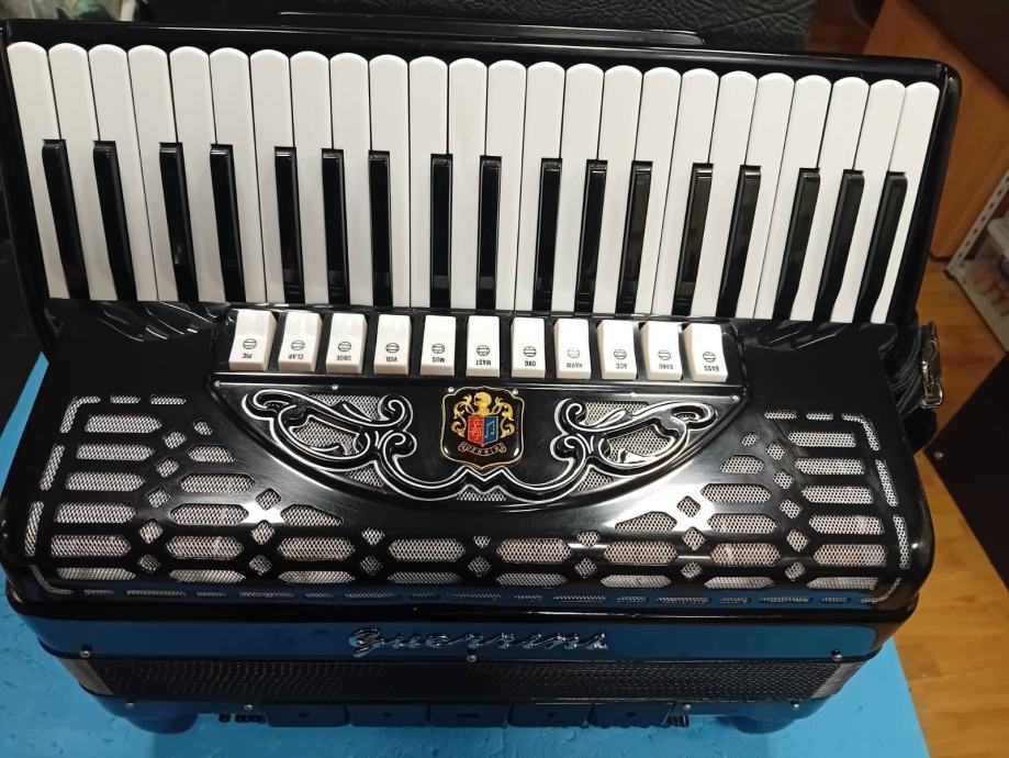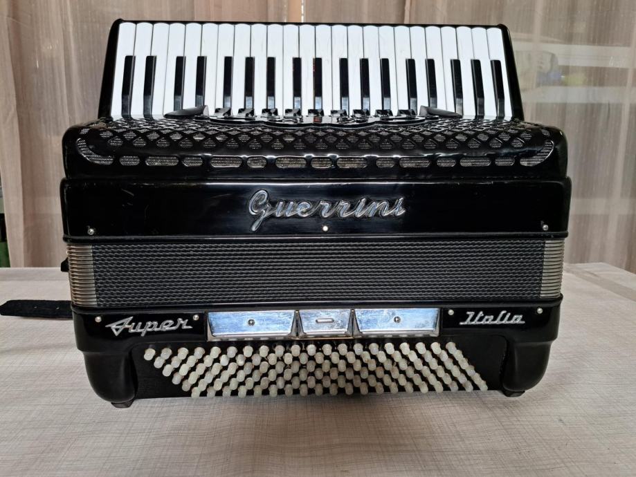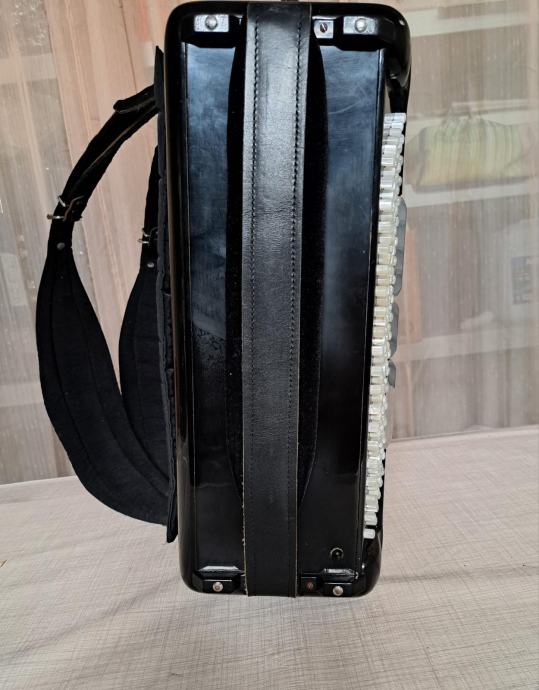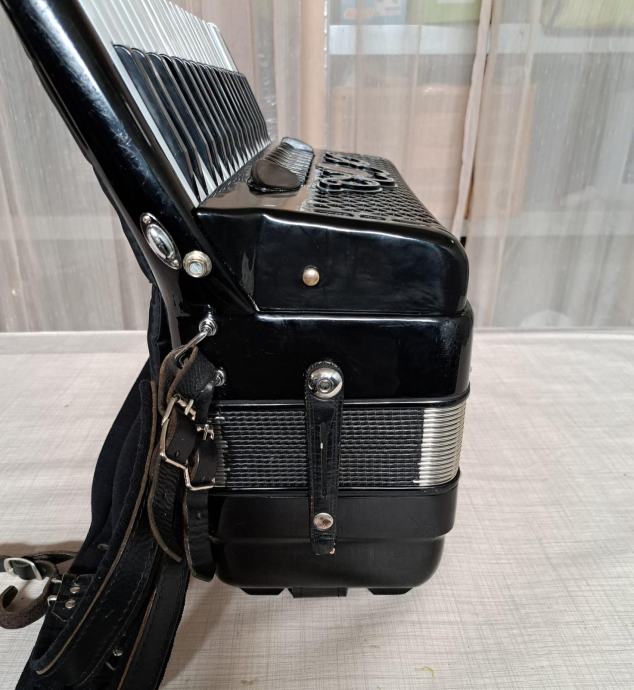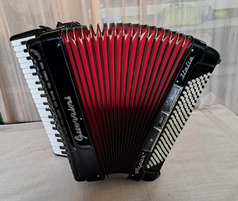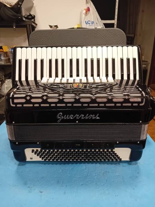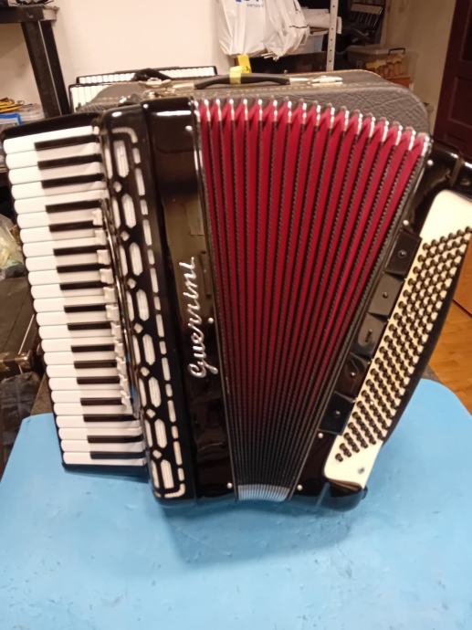 - talijanska, naštimana, beskabinska četveroglasna harmonika Guerrini 11+M+5 120b. Na harmonici se nalazi novo remenje (leđa + bas) te nov jastučić za mijeh. Harmonika je naštimana te bez ikakvih dodatnih ulaganja. Cijena harmonike iznosi 2.090€.