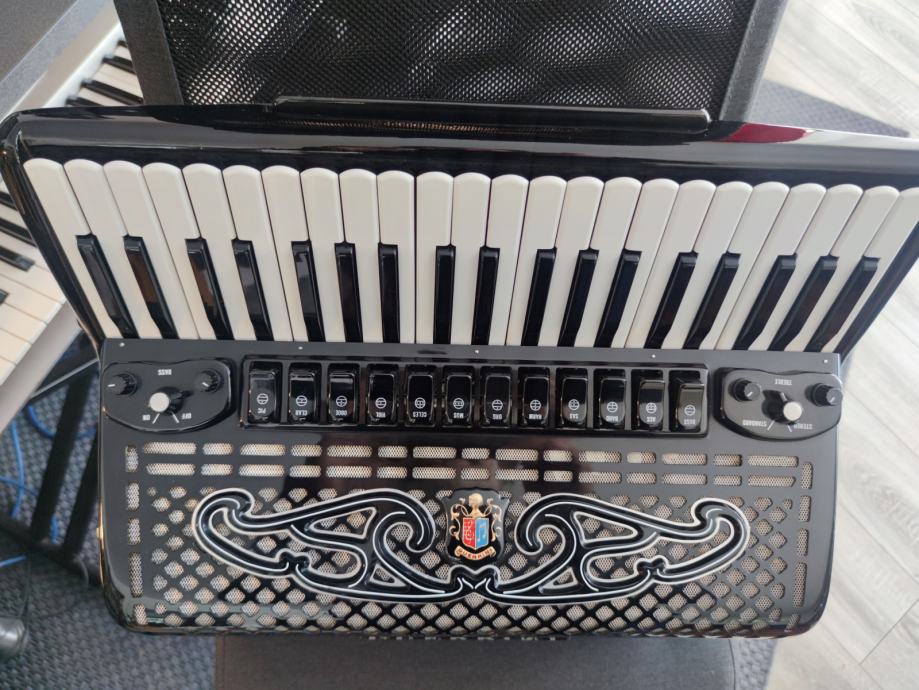 Opremljena brzom klavijaturom s kratkim hodom, 13 (+ 2 master) registra u primu i 9 registara u basu. Ove je godine stručno pregledana i servisirana, prodaje se, ili mijenja za lakšu odgovarajuću harmoniku (do 11kg). Može i zamjena za novi instrument.