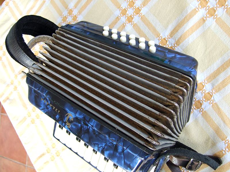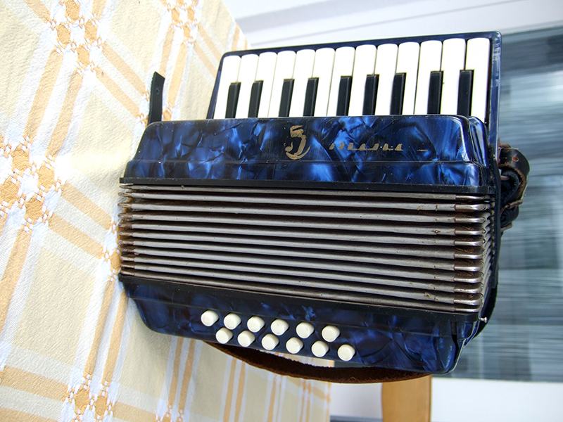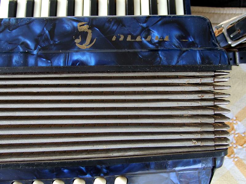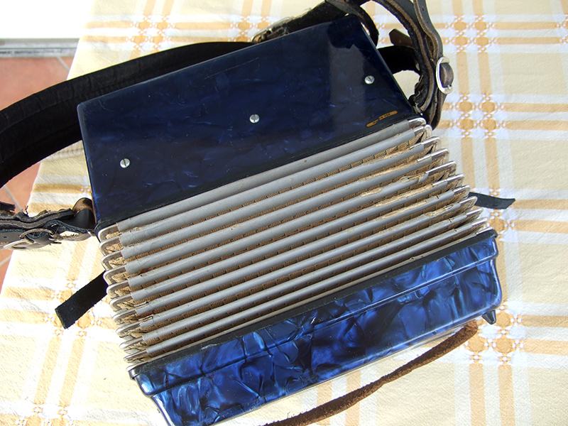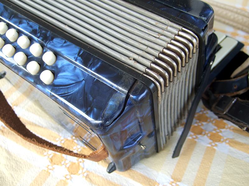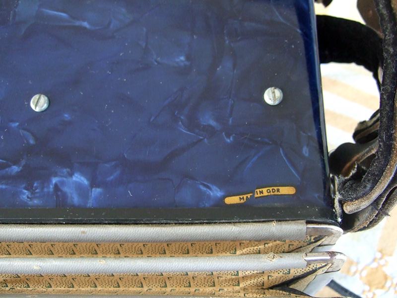 Prodajem staru harmoniku od 12 basova Made in GDR plavi “pearloid” izgled, ne znam koja marka, vrlo je vjerojatno da se radi o harmonici proizvedenoj u Klingenthalu (Istočna Njemačka). Kod takvih malih harmonika iz GDR-a najčešće dolaze u obzir Weltmeister (VEB Klingenthaler Harmonikawerke), ali nisam 100% siguran.