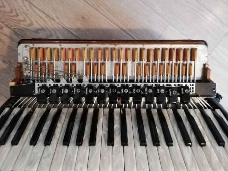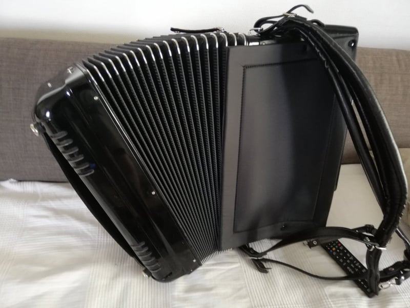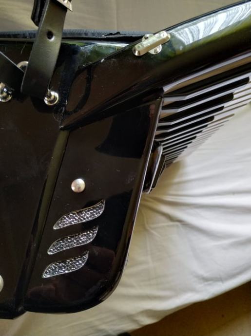 Fenomenalna harmonika vrhunske kvalitete, originalna nije nikakva prerada i sl..Kompresija mijeha potpuna, klavijatura vrhunska, plitka(hod tipke 2,5mm), ugodna, brza..Tonski je izuzetno glasna, moćna, na razglasu perfektno radi..ne guši.. Tonovi prve klase.. Rijetko koja poznatija i razvikanija marka harmonika se može nositi sa ovom harmonikom..Glavna odlika ove harmonike je to što je teška samo 11,3kg i u odnosu na 13,5kg koliko su obicno teške dvokabinske harmonike razlika je i te kako osjetna..Apsolutna garancija na tonsku, tehničku i estetsku ispravnost..
