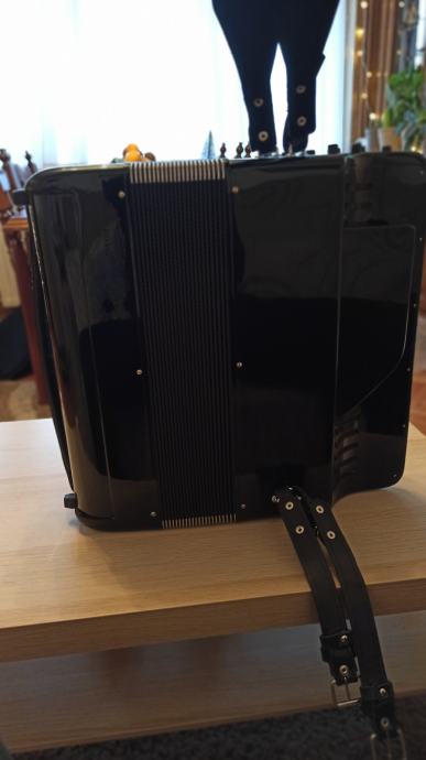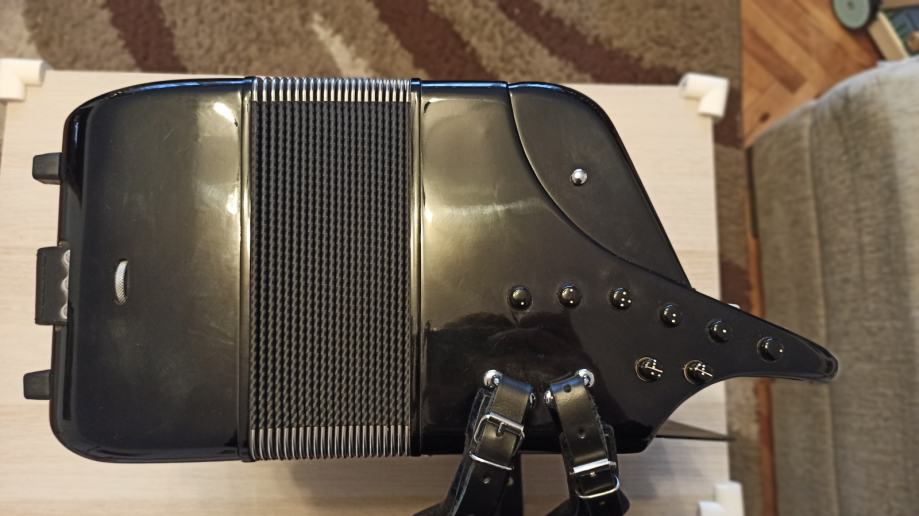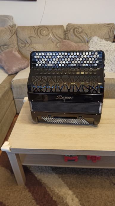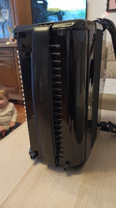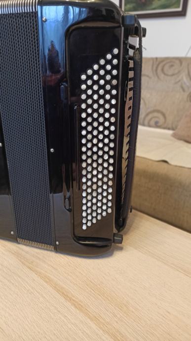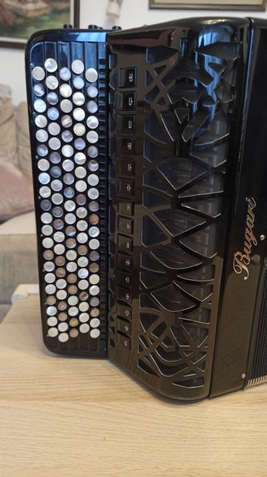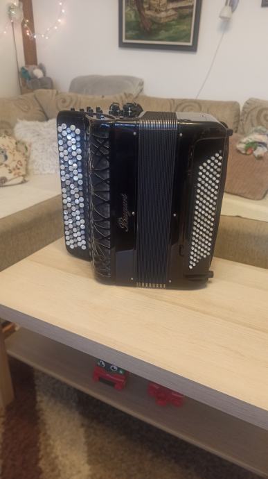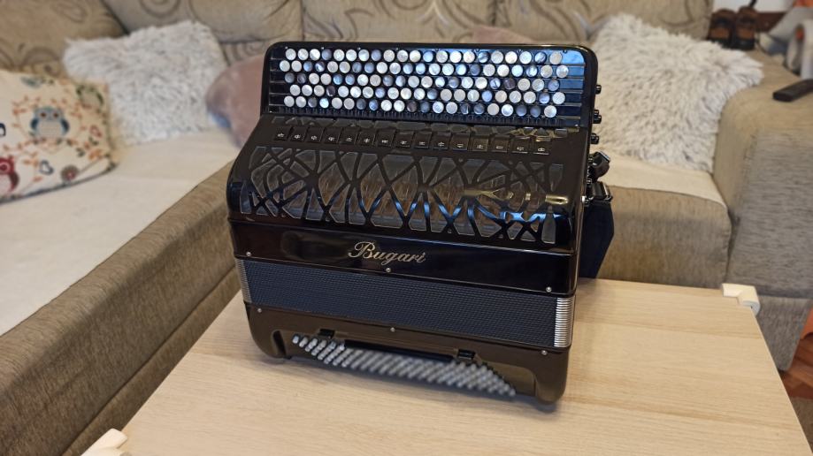 Prodajem harmoniku Bugari Prime, B- grif u obe ruke. Instument je kao nov, bez ogrebotina na celuloidu. Mehanički savršena, neverovatno meka na oba manuala. Desna strana ima sedefaste dugmice i dva switch bradna registra. Leva ruka poseduje duplu osmicu i poseduje sordinu što se može videti na slikama. Uz instument idu novi kaiševi i ranac za harmoniku. Pišite za više informacija.