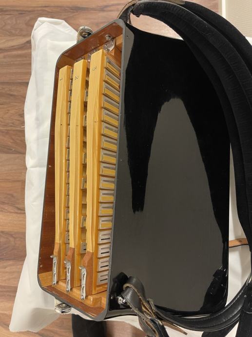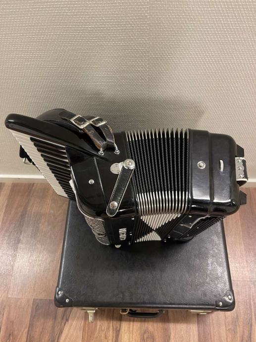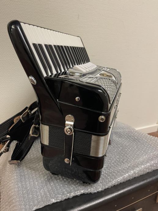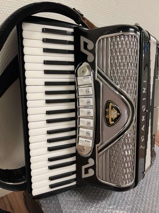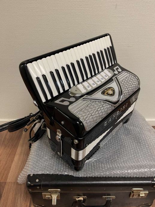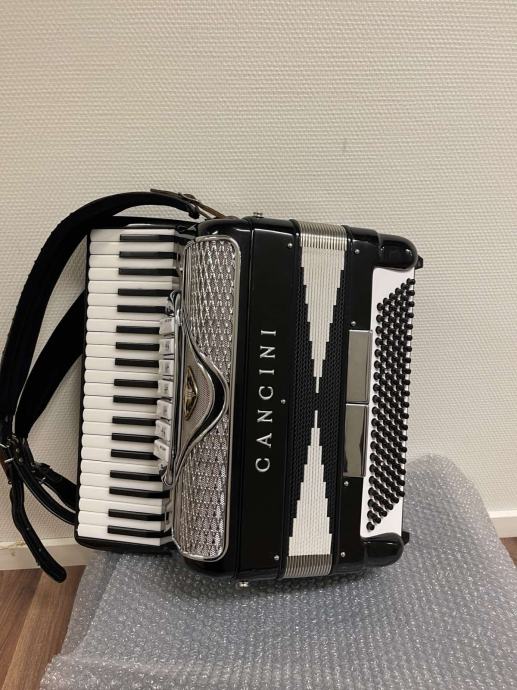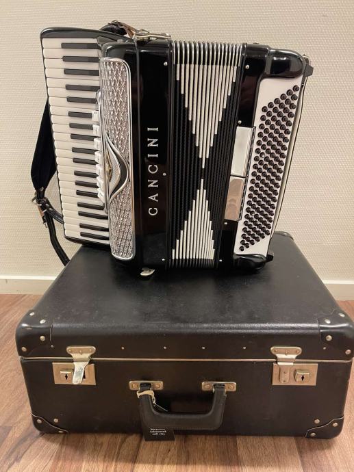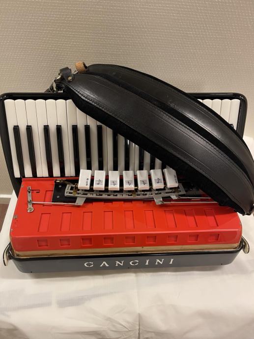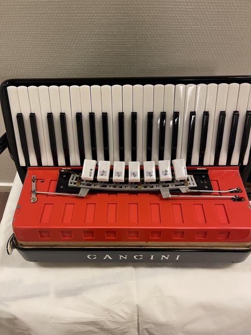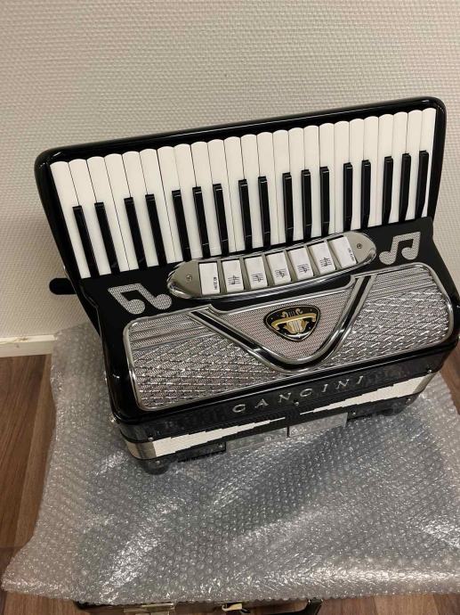Harmonika original Italijanska Cancini 120 basova, 7+2 registra, 3 glasna, sa sordinom , Dihtacija 100%,Fabričko stanje ,manji format, sa originalnim koferom,Pikolo štim, polovinom Decembra dostupna u BIH