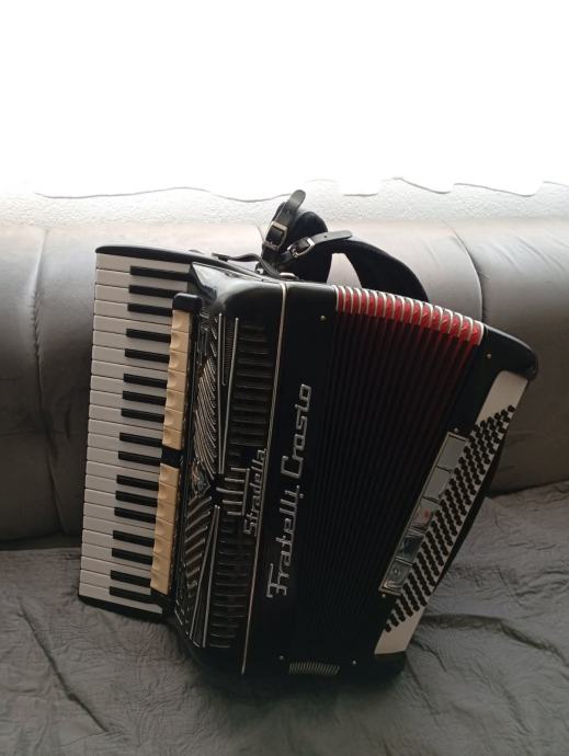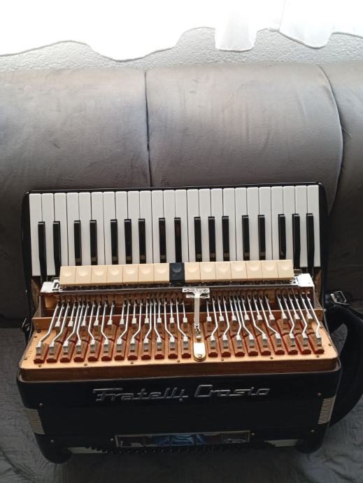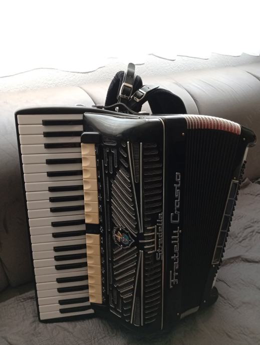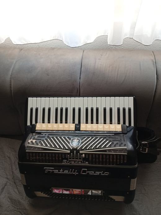 Harmonika Fratelli Crosio 2+2, profesionalni model, POVOLJNO! Stanje potpuno uredno - uzmi i sviraj! Lijep talijanski originalni instrument rađen u Stradelli u suodnosu s Dallape. Maksimalan broj potpuno različitih registara u klavijaturi 15, što je i zapravo savršeno. Težina 12,8 kg, tipka vrlo uredna i ugodna za sviranje. Tonski opasno odlična harmonika - lijep ugodan, po potrebi glasan ton koji podsjeća na Dallape. Ovaj dvokabinski model s 15 različitih registara za uživanje u nijansama boja tona, je i ponajbolji od tradicionalnih modela brenda Fratelli Crosio. Cijena za gotovinu 2599 eura, fiksno. Kontakt +385996022987 (RH), Ivan