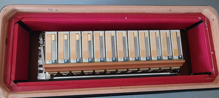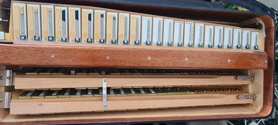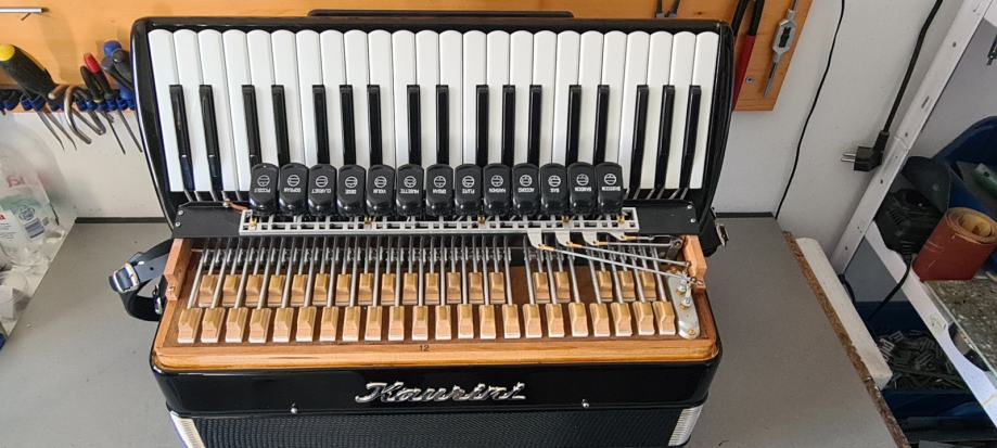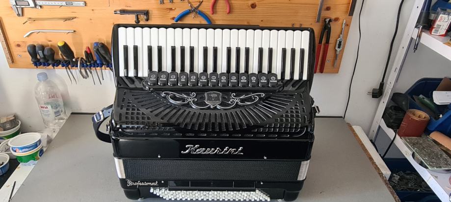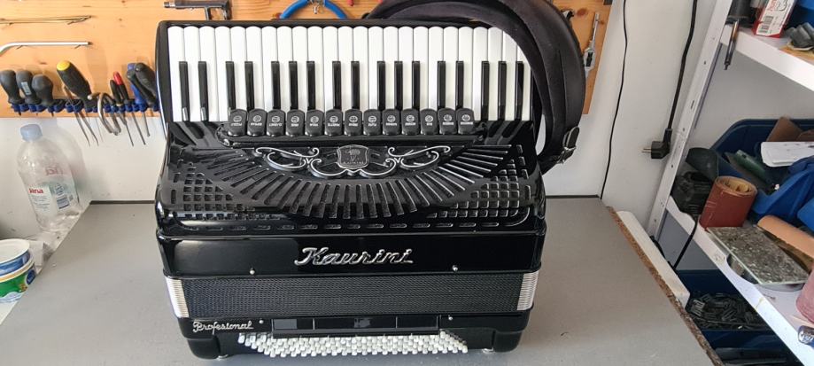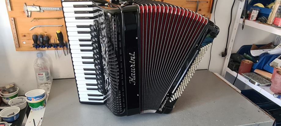Harmonika Kaurini 120b, dupla kabina, 13+1+7 registara. Tonovi a mano prva klasa Artigiana B turbo. Harmonika je potpuno nova sa 2 godine garancije. Cijena 5600€.