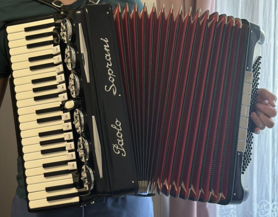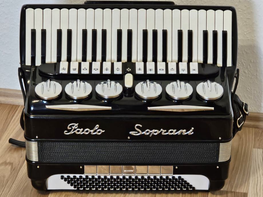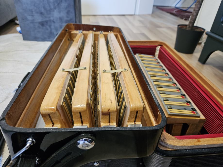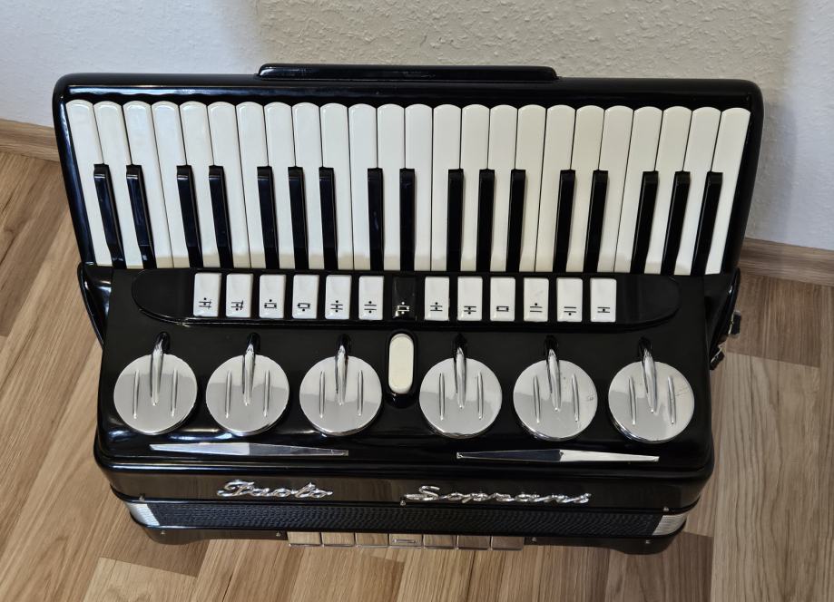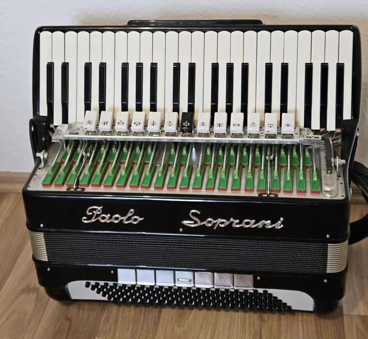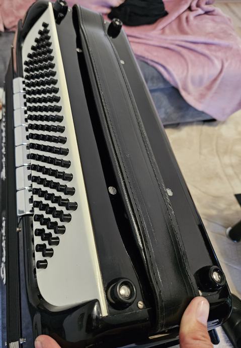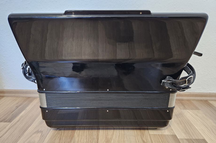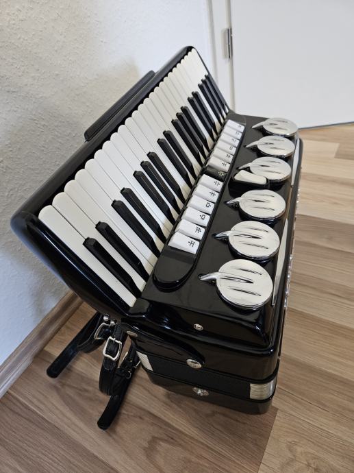 Tehnicki odlicna klavijatura na 2 osovine, tonski jaka i glasna ,a sa klapnama na deklu u basonu dobija kabinski zvuk...u basovima G fasen.