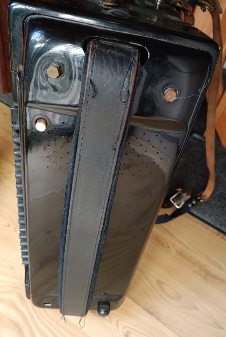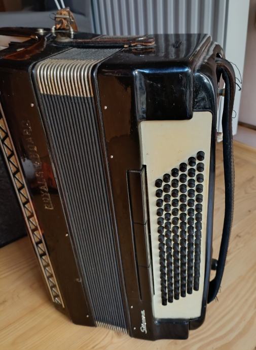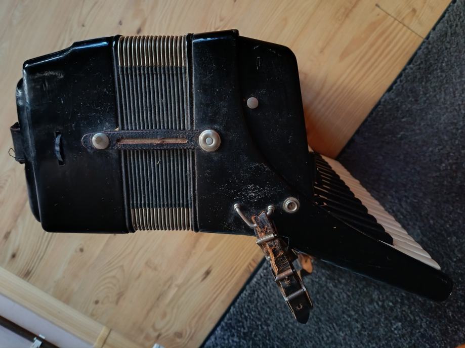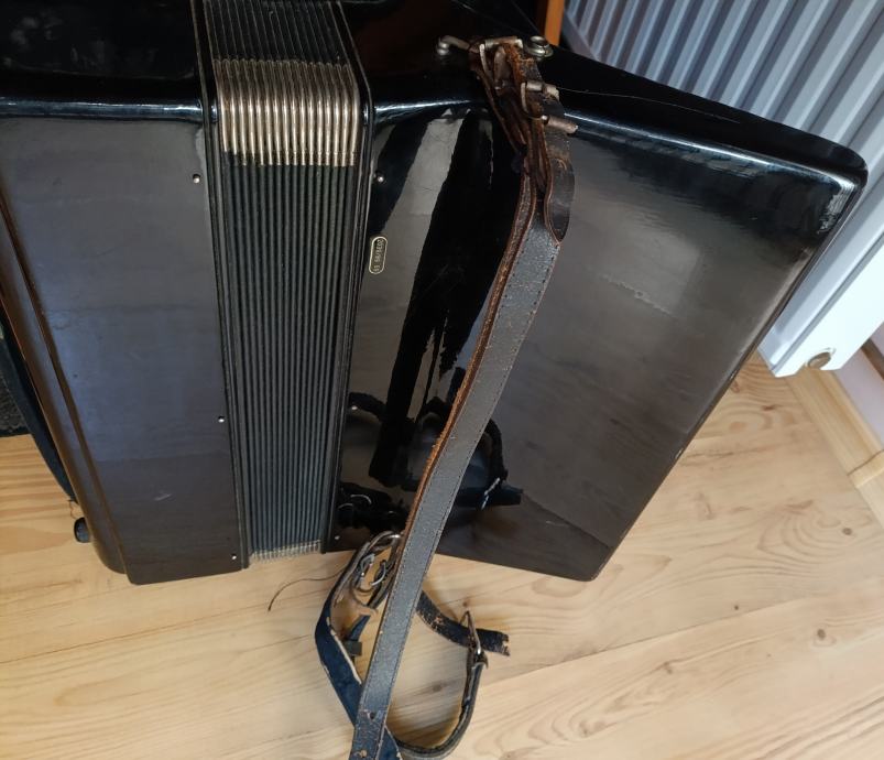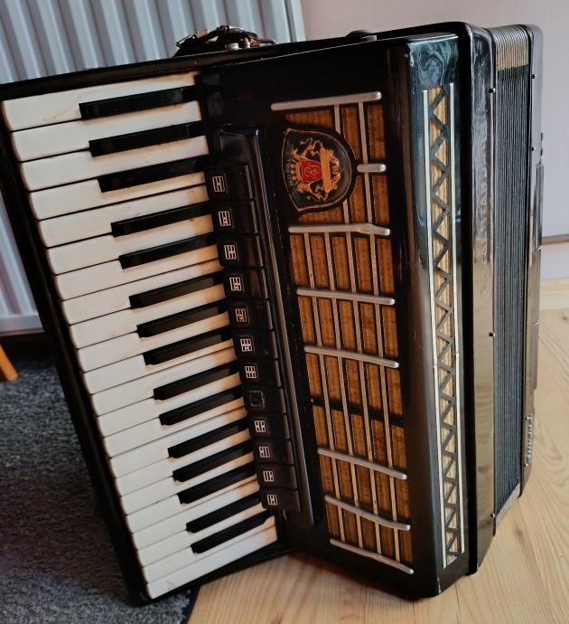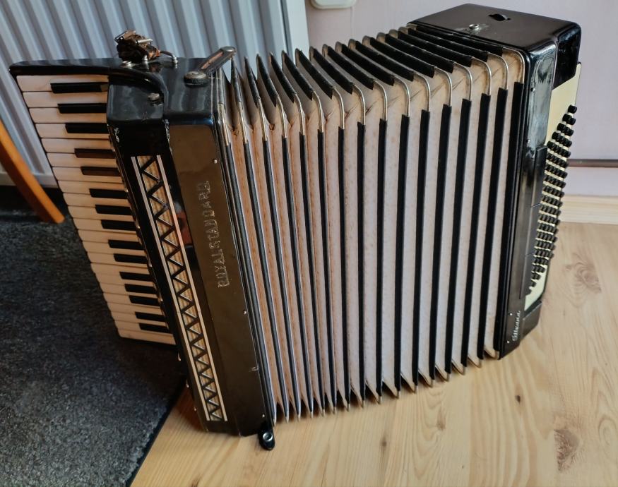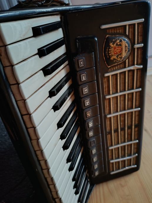 Prodaje se harmonika Royal Standard 96 basova, kupljena nova 70-tih godina. Nažalost, kofer smo negdje zagubili. Rijetko korištena, samo u kućnom okruženju. Ispravna, ali već neko vrijeme samo stoji pa vjerujem da bi ju trebalo malo naštimati i dotjerati pa tko ima volje i želje... Slobodno se može javiti za detalje u inbox. Cijena 350 €, nije fiksno. Nalazim se u Osijeku.