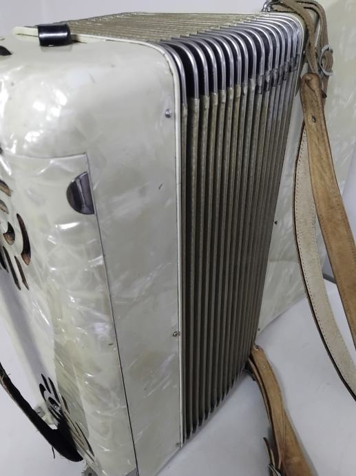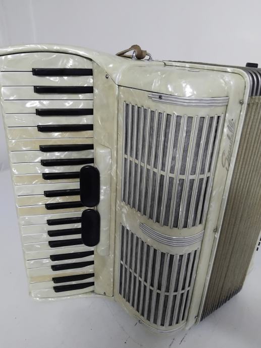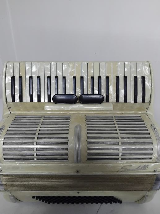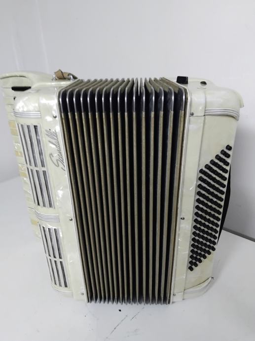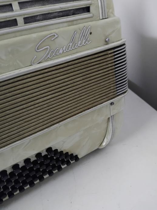Harmonika Scandalli 96 basova, vrlo lijepe sedefaste boje. Klavijatura ima 39 tipki, troglasna je i ima 4 boje tona, a na basovima je peteroglasna i ima dvije boje tona. Harmonika je u originalnom stanju,lijepog tona, potpuno je ispravna,lagana za sviranje i sve na njoj radi i funkcionira.Pogodna za muzičku školu.