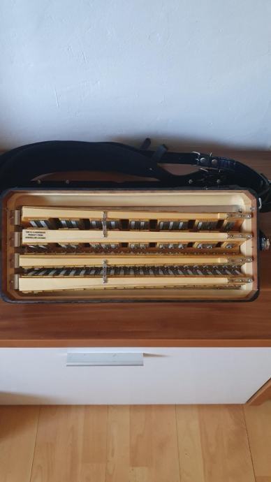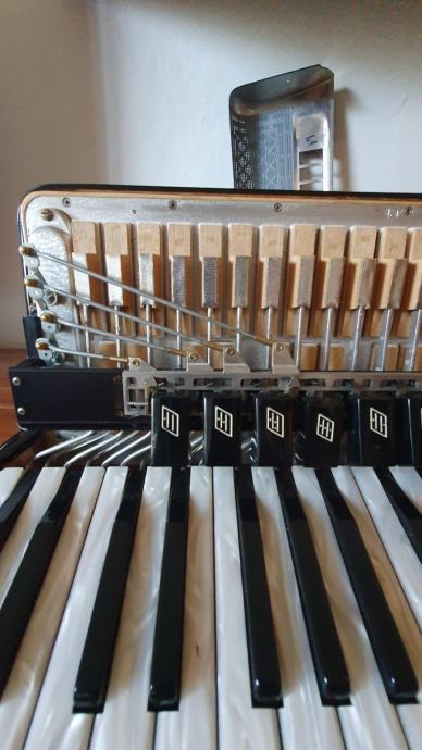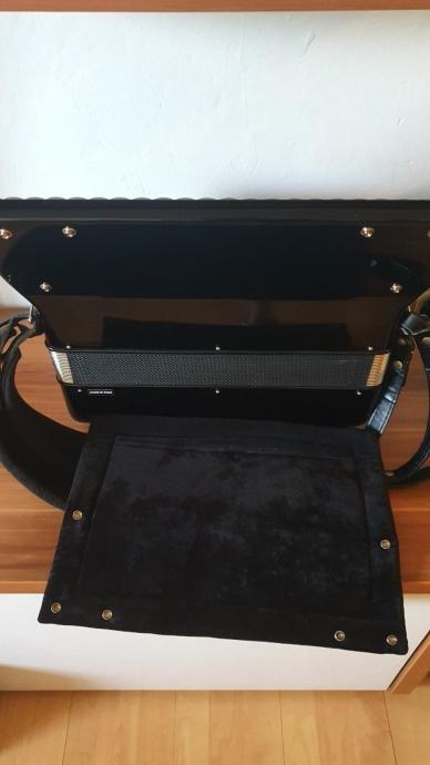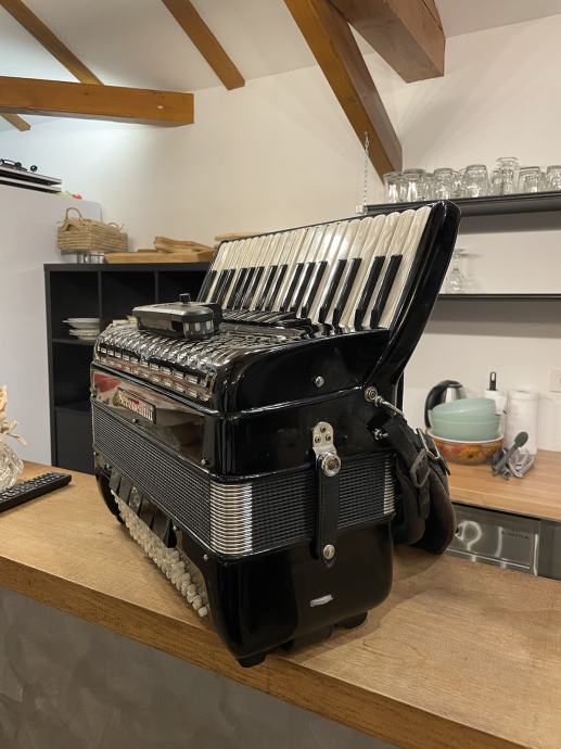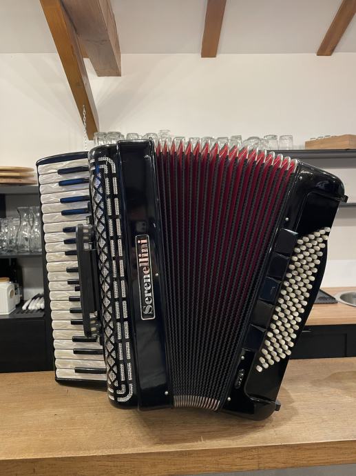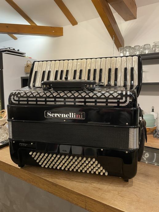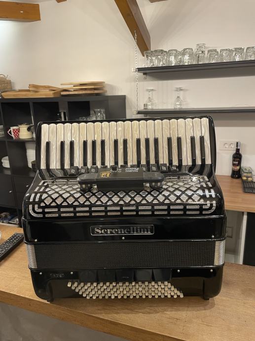 Harmonika Serenellini, model 374, 4/5 glasna, 96 basova, sa pikolom, tonovi tipo a mano, sedef tipka, široki remeni, jastuk, kofer. Stara 7 god. Kupljena u tvornici Serenellini Accordions srl, via Brecce, 52 - 60025 Loreto Italy.