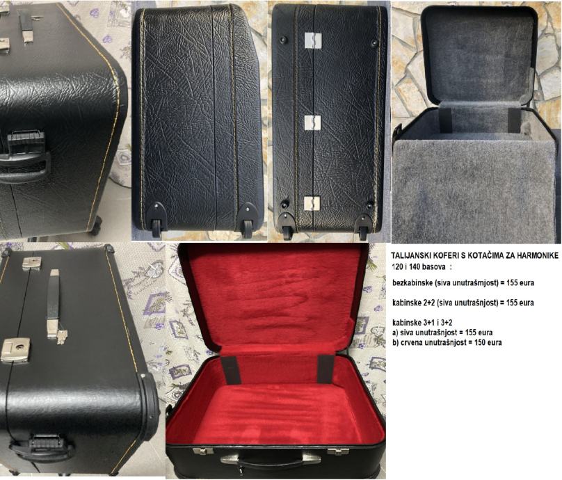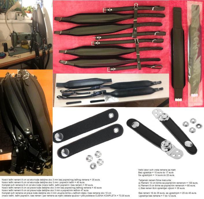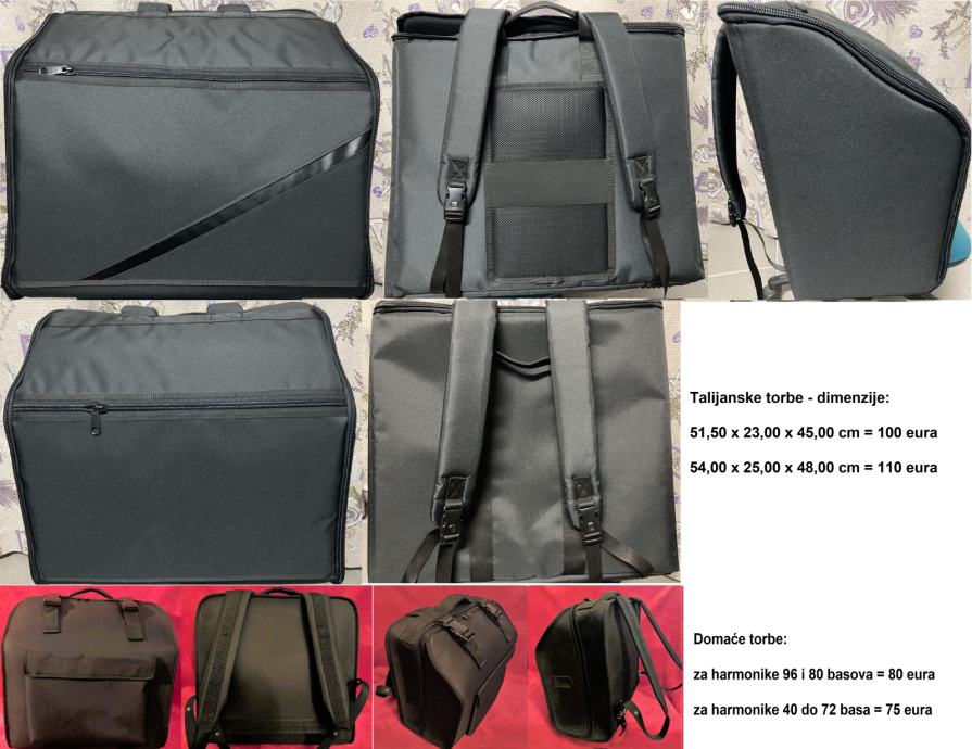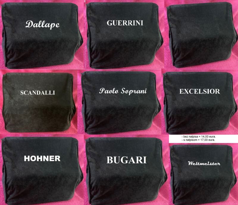 - nove torbe za harmonike od malih harmonika 80 basova do velikih 140 basova sa duplom kabinom 3+2.