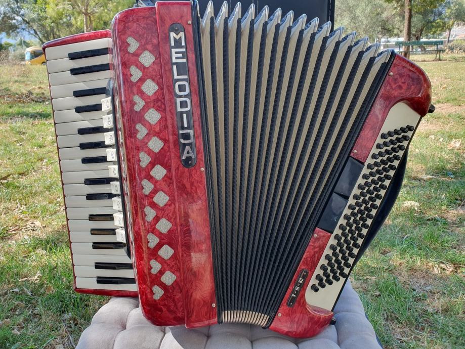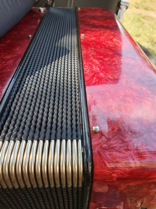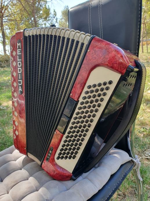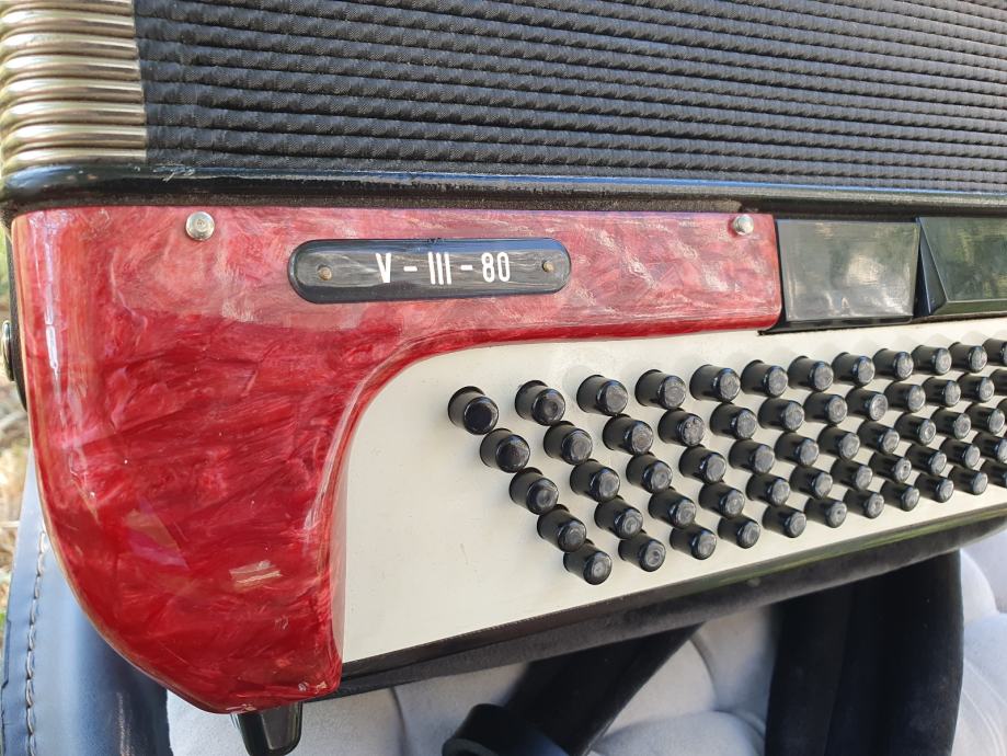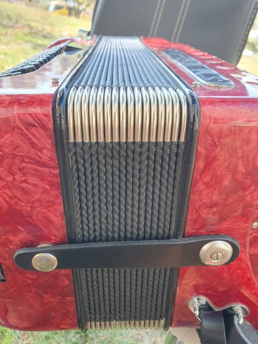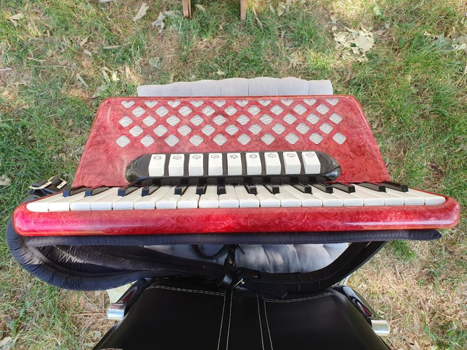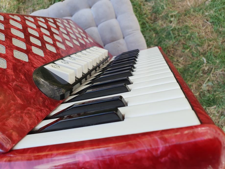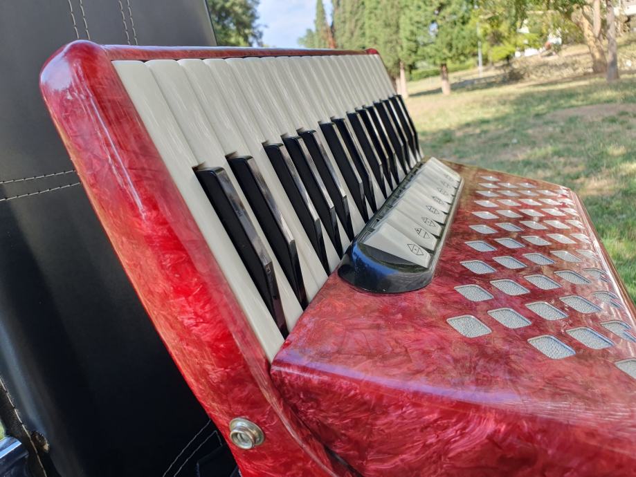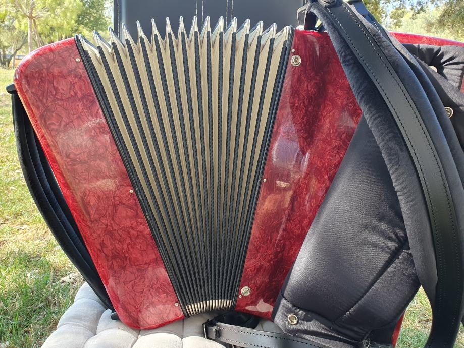 Harmonika je kao nova iz ducana,nekoristena,prekrasno zvuci.Unutar instrumenta vrhunski talijanski tonovi.Na harmoniku sam stavio nove italijanske remene(basni+ledjni)+nov jastuk za mijeh od najfinijeg italijanskog satena,zbog cuvanja samog mijeha i vece udobnosti pri sviranju.Klavijatura je mekana i brza,plitka tipka,na osovini.Bas je rezak i dubok.Svi registri imaju punocu zvuka i izrazajnost.Uz harmoniku ide njen pripadajuci cetvrtasti italijanski kofer.Obradujte sebe ili nekog svog najmilijeg kupovinom ove prekrasne harmonike i unesite radost i srecu u svoj dom.Nalazi se u Splitu.Sve informacije na tel.097/6476049 (viber,whatsup),Mladen!