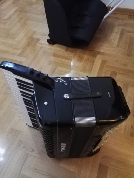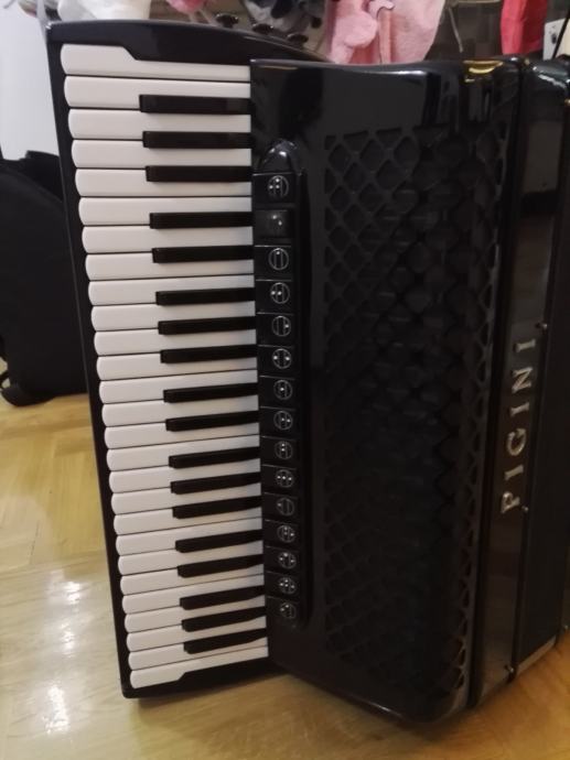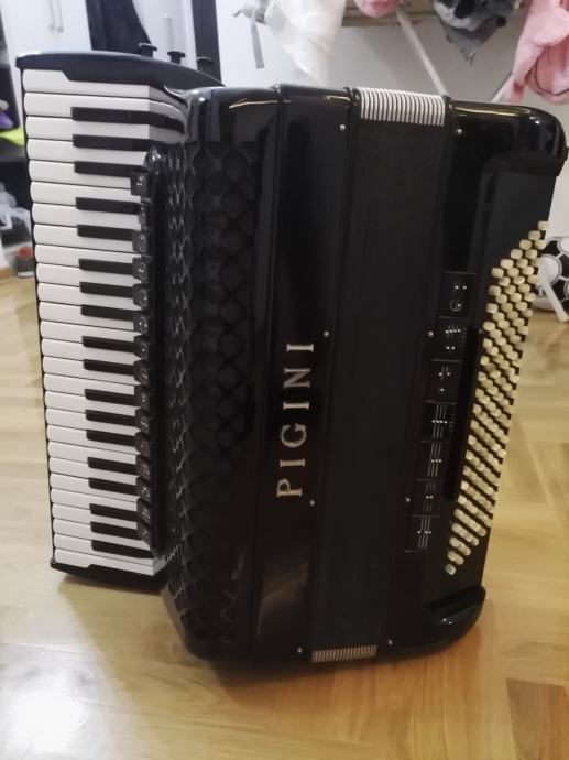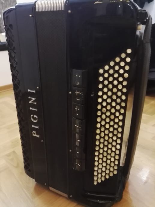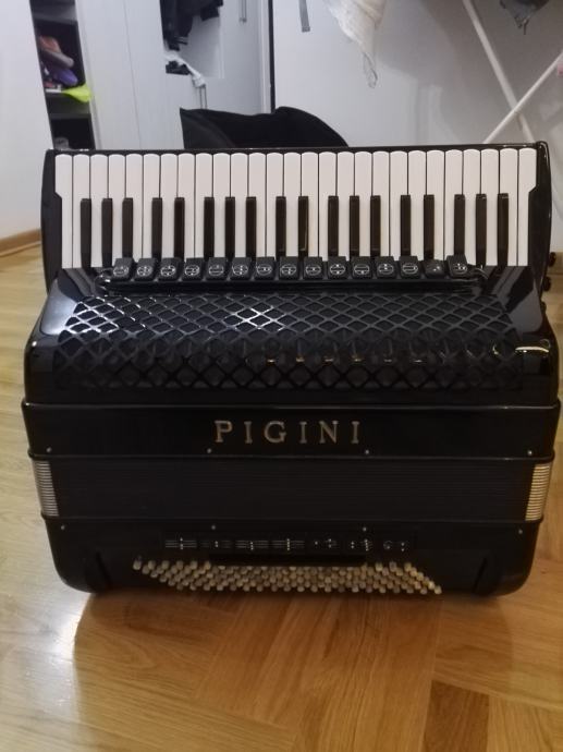 Klavirska harmonika Pigini 55P/45, četvoroglasna, dve kabine, produžena klavijatura 45 dirki, 15 registara u desnoj, 3 bradna registra, 7 registara u levoj, konvertor, 55 baritona, c-grif u baritonu. Perfektno stanje harmonike, donešena iz Italije.