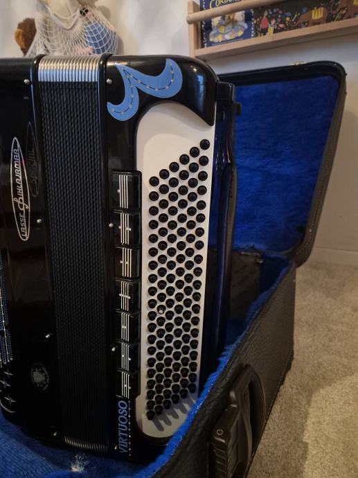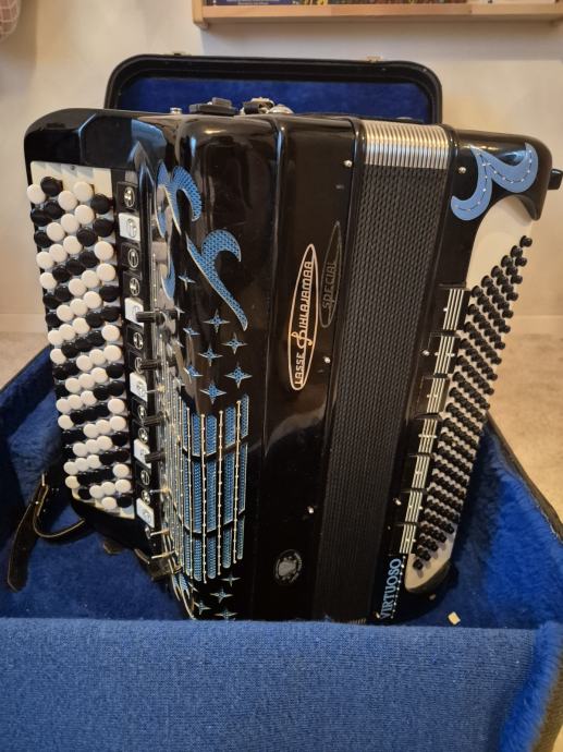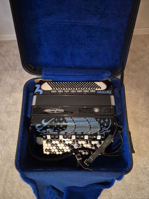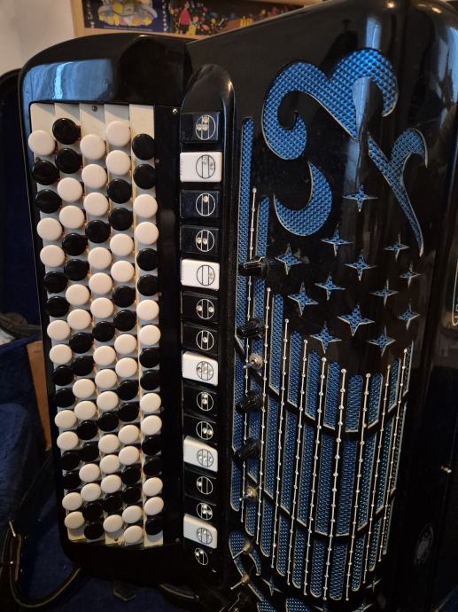 Prodajem navedenu harmoniku u odličnom stanju, štimana prije mjesec dana. Harmonika je rađena za skandinavsko tržište i ima vrlo kvalitetne tonove. Lagana je (oko 10 kg), što ju čini vrlo praktičnom za svirke. Ima direktan zvuk, dihtacija radi jako dobro za te godine.