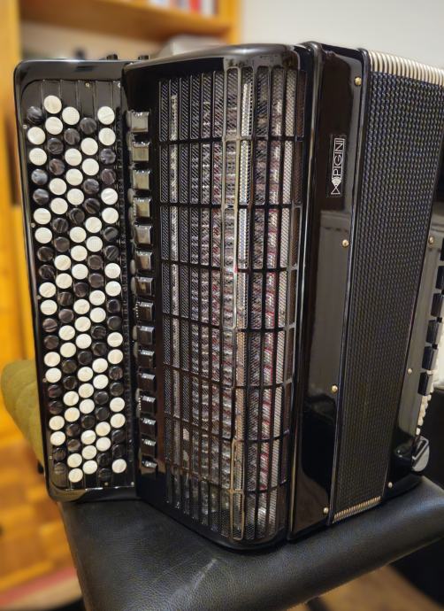 Ugođena na 442 Hz, C griff i s konvertorom - melodični bas. Ima 120 basova i 7 registara, 106 gumba i 5 registara na desnom manualu i 8 registara za bradu - 3 rotacijska. Harmonika dolazi sa štitnikom za bradu, štitnikom za desni manual, tvrdom originalnom kutijom, originalnim naramenicama i originalnim ruksakom za harmoniku.