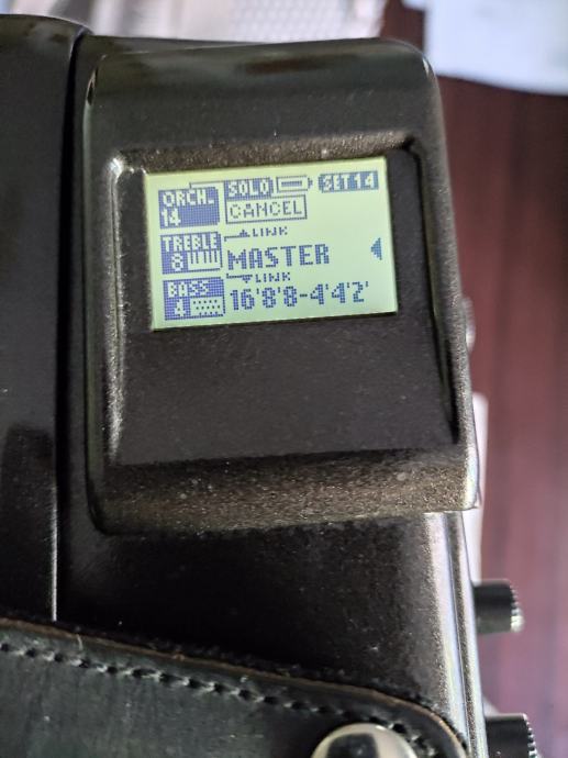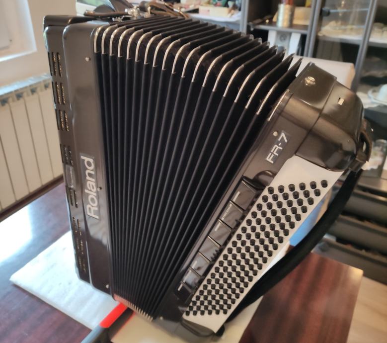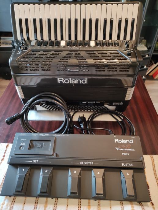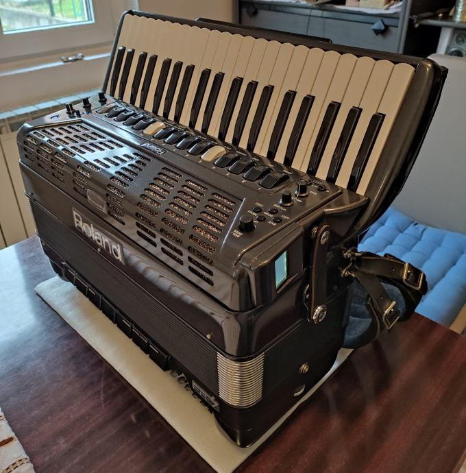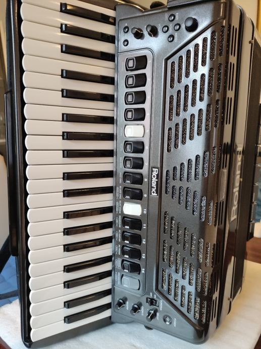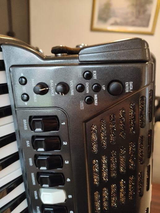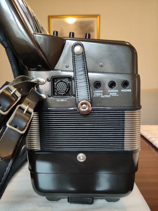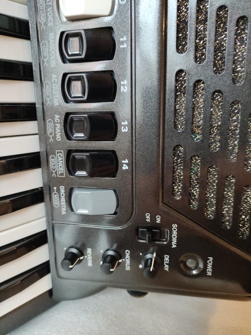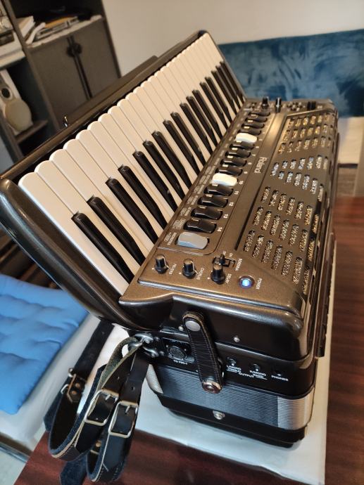 Harmonika vrlo, vrlo malo korištena nikad na gažama. Baterija izdrži devet sati neprekidnog sviranja. Uz harmoniku ide knjiga uputstva pedala i kablovi također i pripadajuće torbe.