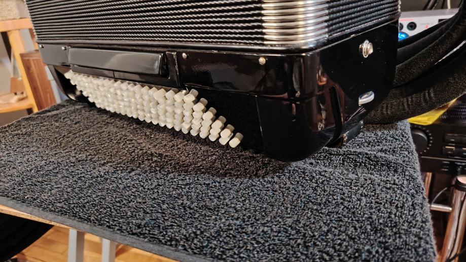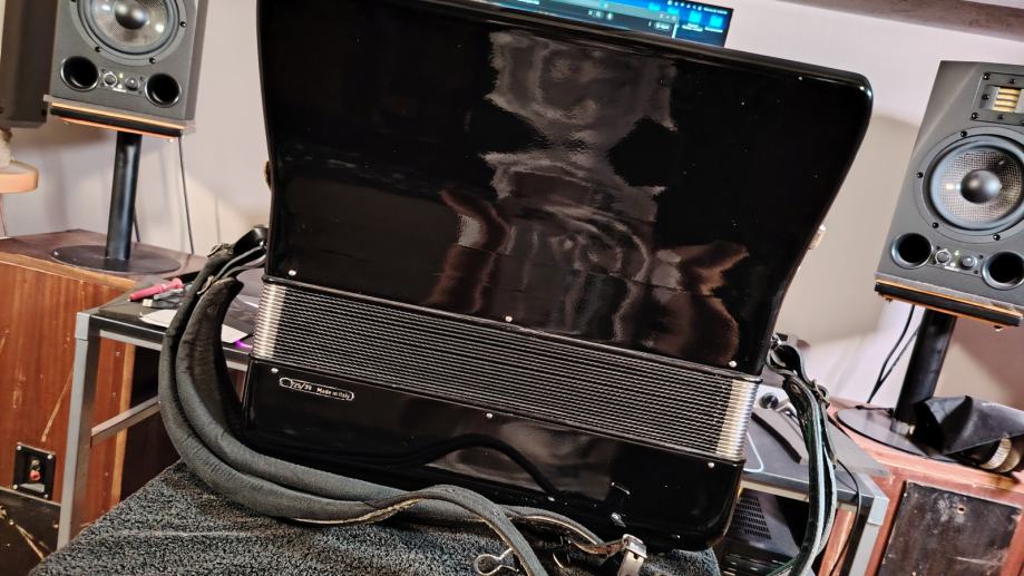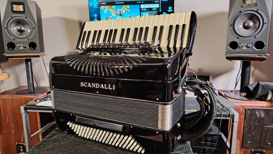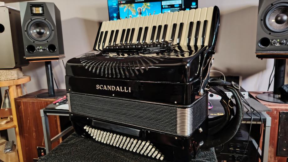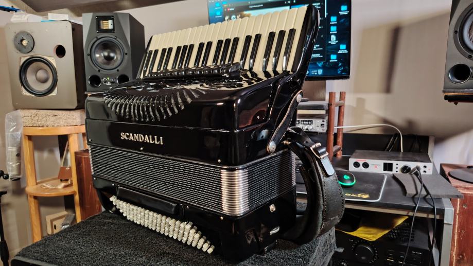 Na prodaju harmonika poznatog brenda " Scandalli ". Instrument je u odlicnom stanju. U levoj ruci ima 120 basova sa petoglasnim basom, desna ruka 2+2 fasena u kabina, sto znaci da ima i veliku i malu kabinu. Ton je prepoznatljiv i autentican sto jedino mozete osetiti ukoliko probate. Jako ozbijan instrument lakse kilaze. Za cenu je moguce postici dogovor ukoliko ste ozbiljni i ne zovete cisto radi reda. Preporuka da prvo probate!