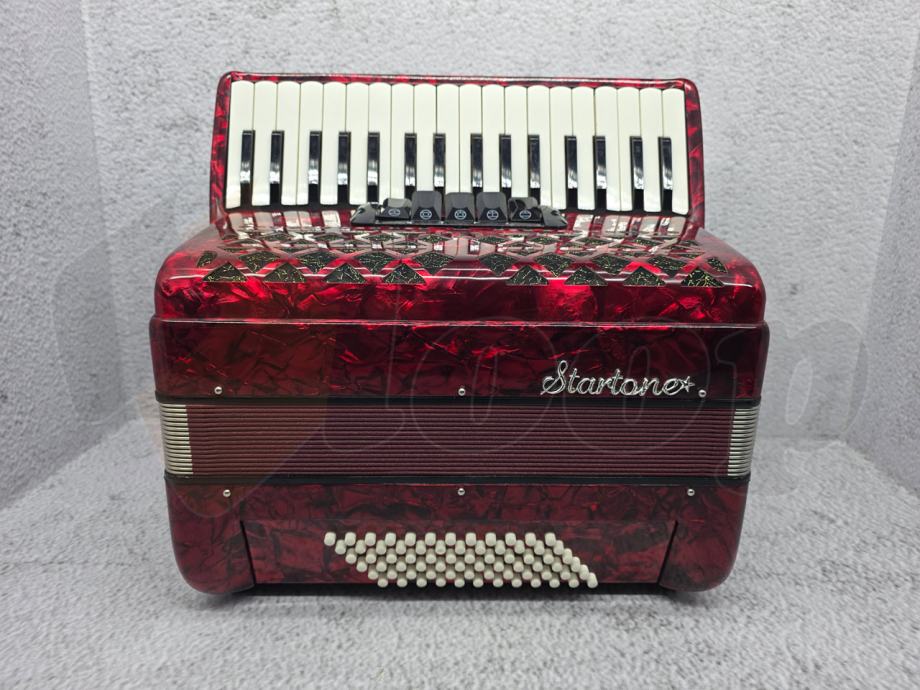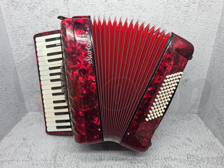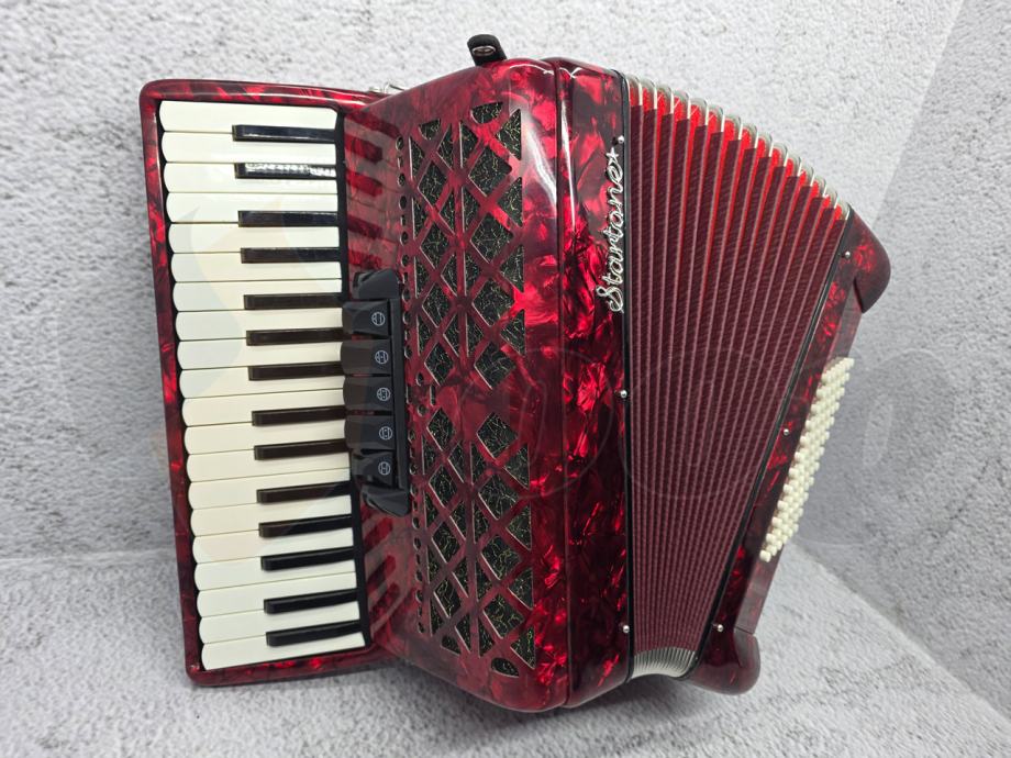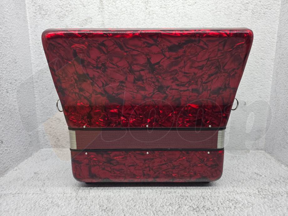 nekorištena troglasna harmonika, 7+2 registra, 72 basova, 37 tipki; izložbeni primjerak, izložena u shopu, boja - CRVENA! Težina 8 kg, dimenzije: 41 x 19 x 43 cm.