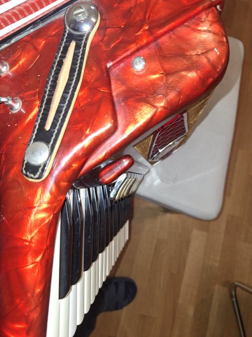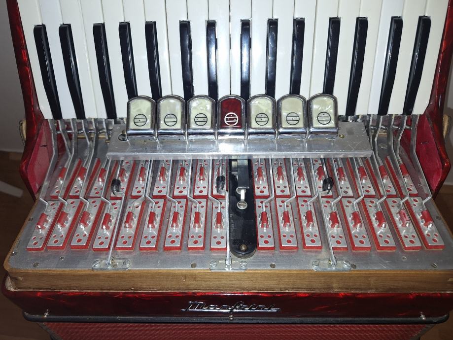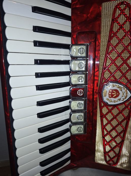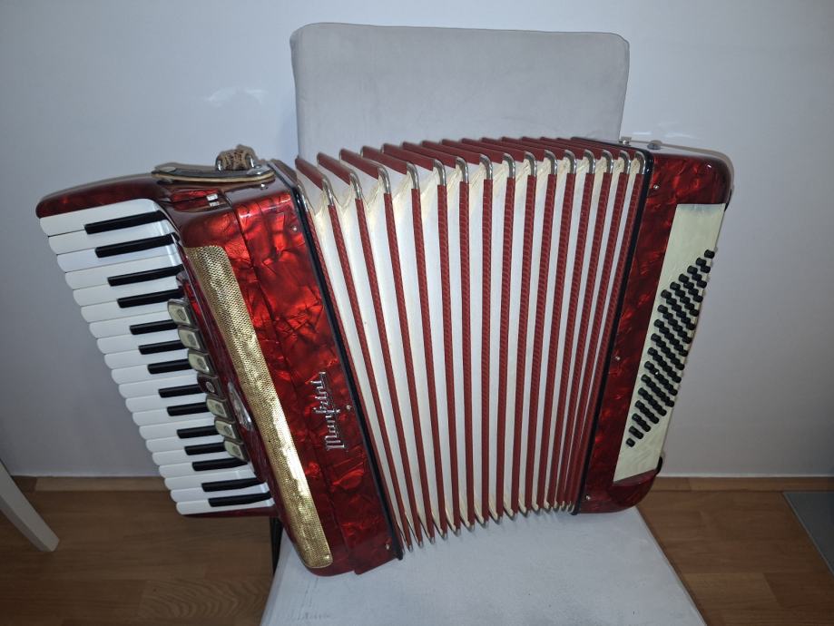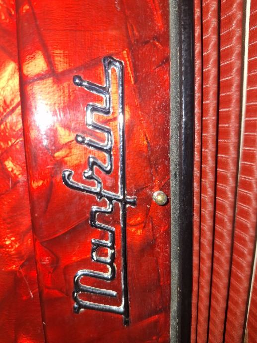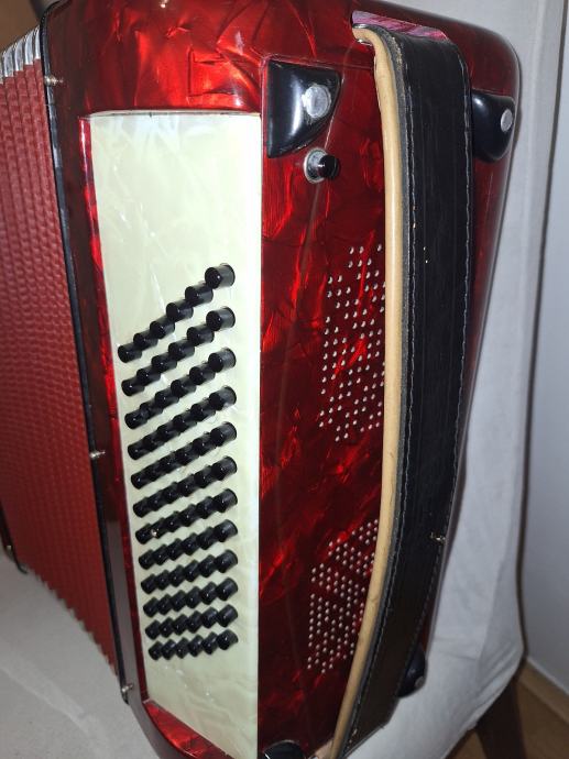 Originalna talijanska harmonika Manfrini 72 basova, troglasna u primu i četveroglasna u basu. Svi tonovi sviraju, naštimana i redovito servisirana. Harmonika je vrlo glasna i lagana. Dihtacija mijeha 100 posto. Tipka brza, mekana i plitka. Odlična za glazbenu školu. Uz harmoniku ide originalni talijanski kofer.