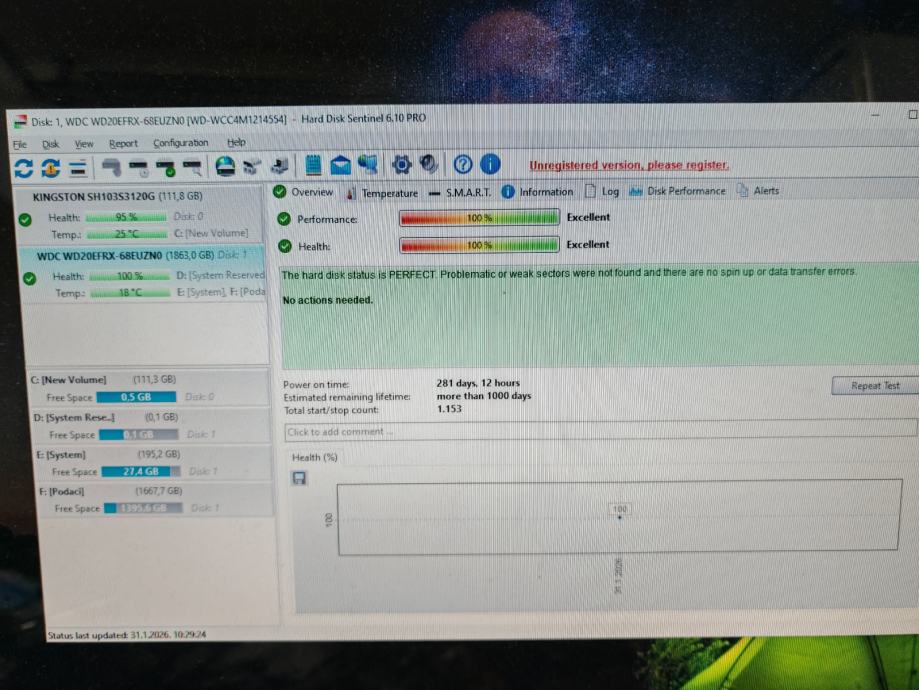 Prodajem Western Digital Red hard disk kapaciteta 2TB (2000GB), dimenzije 3.5 inča sa SATA sučeljem. WD Red serija je poznata po pouzdanosti i optimizirana je za rad u NAS sustavima i serverima, gdje diskovi rade kontinuirano. Disk je testiran i u ispravnom je stanju, što je vidljivo iz priloženog ispisa dijagnostike. Svi parametri su u odličnom stanju, bez realiziranih sektora i grešaka.