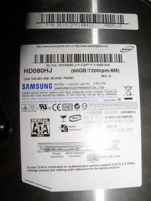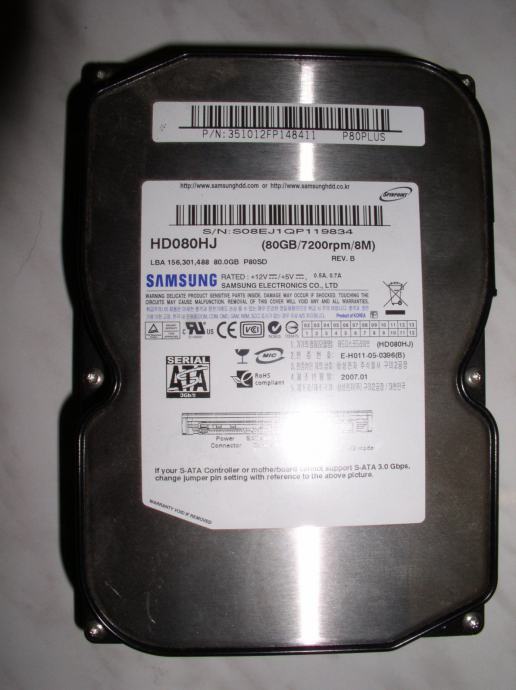 Samsung hard disk model HD080HJ SATA 80Gb /7200 rpm /8 Mb ispravan prodajem.