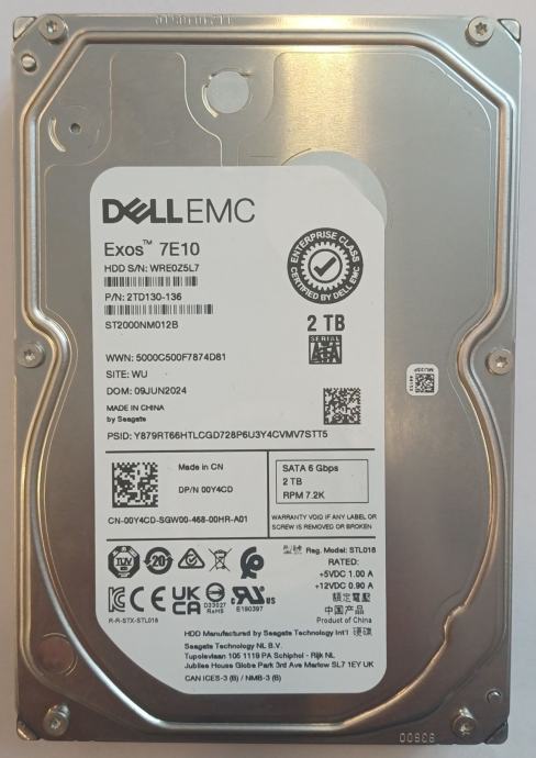 Serverski HDD DELL EMC 00Y4CD / SEAGATE EXOS 7E10 ST2000NM012B 2TB SATA 7.2K 6GBPS 3.5" Drive