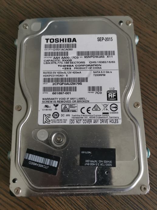 Prodajem HDD Toshiba, 500GB, SATA3, model DT01ACA050. Korišten u uredskom računalu na kojem je uglavnom bio prazan.