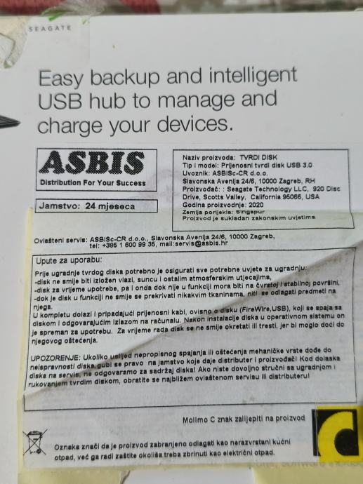 Prodajem vanjski hard disk Seagate Backup Plus s kapacitetom od 6TB (6000GB). Radi se o 3.5-inčnom disku u crnom kućištu. Disk ima USB priključak i pogodan je za pohranu velikih količina podataka, backup sustava ili proširenje prostora za multimedijske sadržaje.
