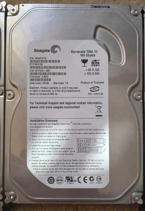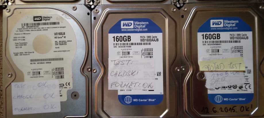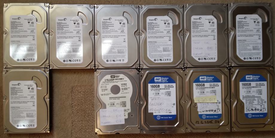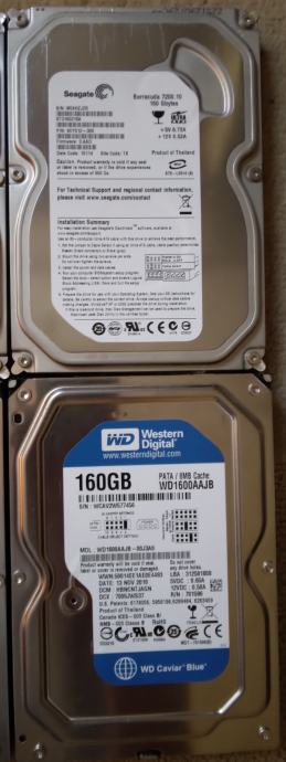 Više komada na prodaju. Svi su 3,5 incha veličine, 160GB kapaciteta, 7200RPM (okretaji), PATA sučelja. Većina ih je Seagate, a nešto Western Digital. Rabljeni, ali ispravni (i testirani). Cijena 6,5€/kom, 2 za 12€, 3 za 16€, 4 za 21€.. Ukupno ih imam 20 komada. 70 € za sve