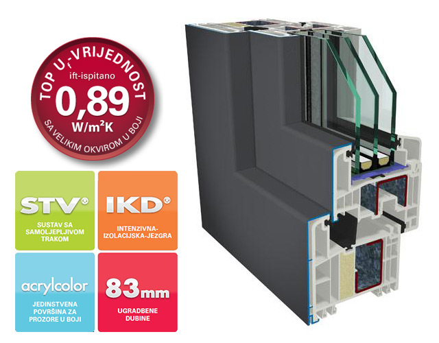 83 mm – ugradbena dubina profila i 3 razine brtvljenja omogućuju izrazito dobra izolacijska svojstva i zaštitu od udara vjetra i prodora vlage. Zboge velike dubine profila omogućena je ugradnja stakala do 54 mm dubine, čime se omogućuje visoka toplotna izolativnost i sigurnosna zaštita unutar objekta.