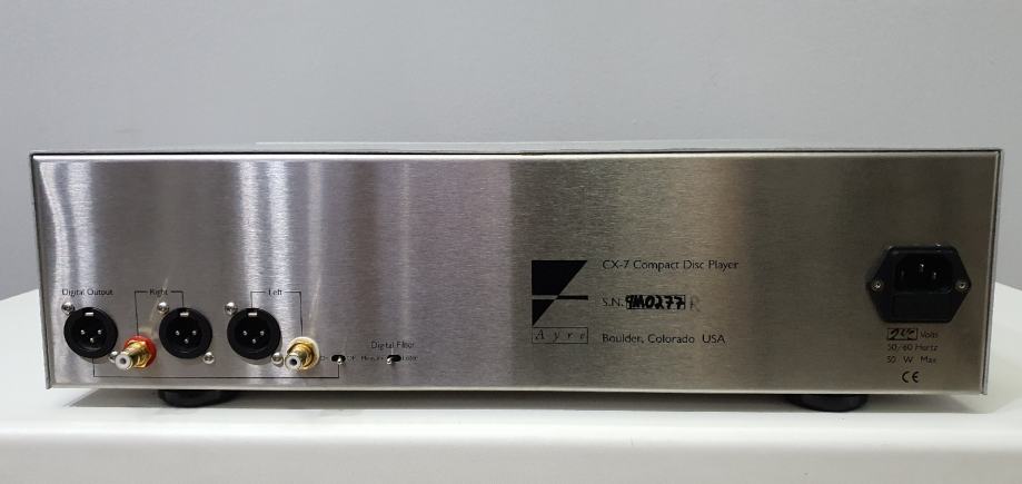 DAC u CX-7, Burr-Brown DF1706, nudi dva filtera, strmi koji optimizira informacije o frekvencijskoj domeni i blagi koji optimizira vremensku domenu. Ayre omogućuje pristup oba filtra preko stražnjeg prekidača s oznakom "measure" za strmi filtar i "listen" za blaži nagib. Stražnja strana također sadrži izlazne priključke - par uravnoteženih i par jednostranih - prekidač za odabir izlaznih priključaka, uravnoteženi digitalni