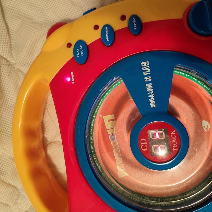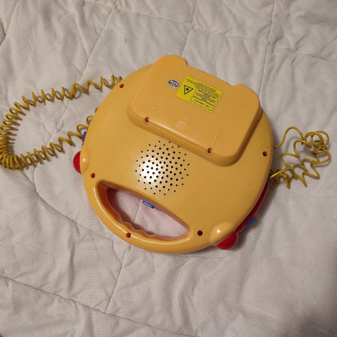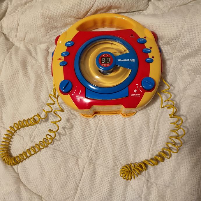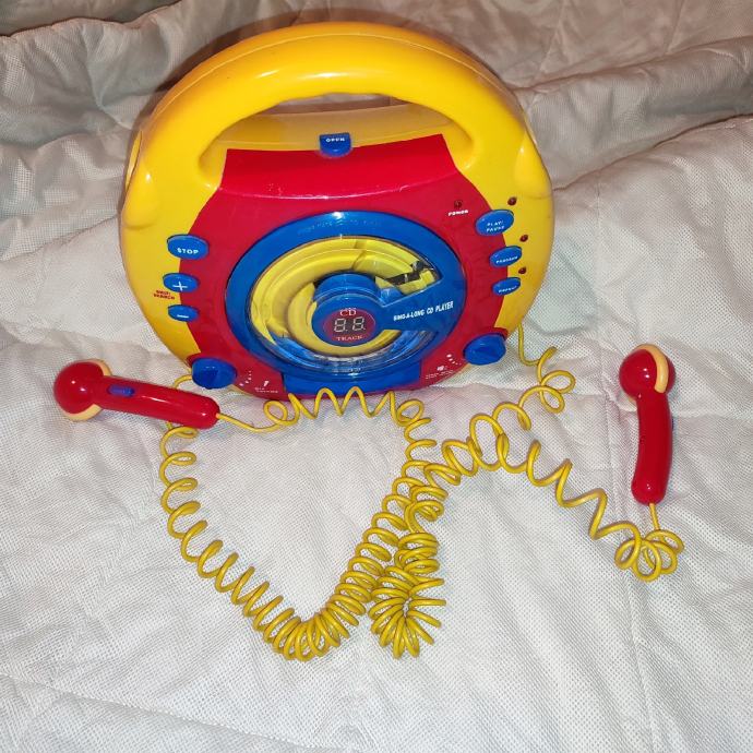 Dječji CD player, karaoke, 2 mikrofona. Radi na baterije. Ima i vanjsko napajanje od 9V, ali mislim da u paketu nismo dobili kabl.