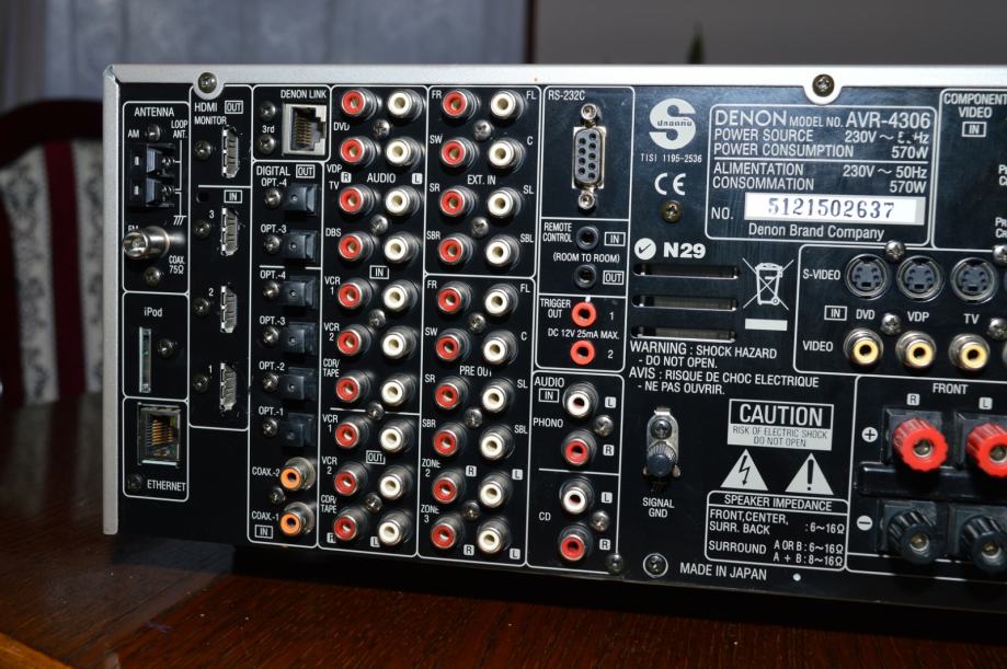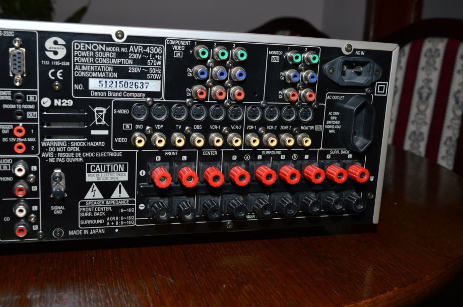 Vrhunski HT receiver Denon Avr 4306 iz vise klase. Cijena novog 2007 god. bila je 1400 eura. Perfektno stanje sa svom opremom predajem . Snaga 7x130 watt na 8 ohm ili 7x170 na 6 ohma . vise informacija mozete pronaci ovdje http://www.audioholics.com/av-receiver-reviews/denon-avr-4306