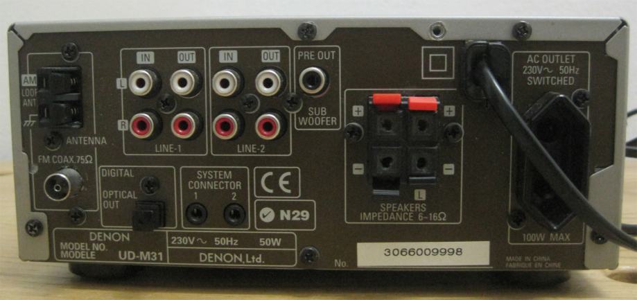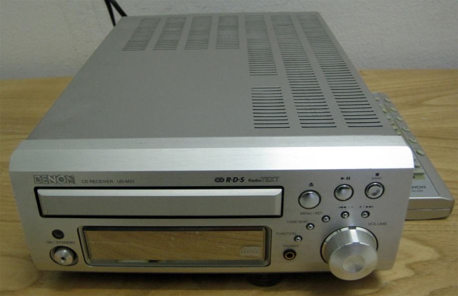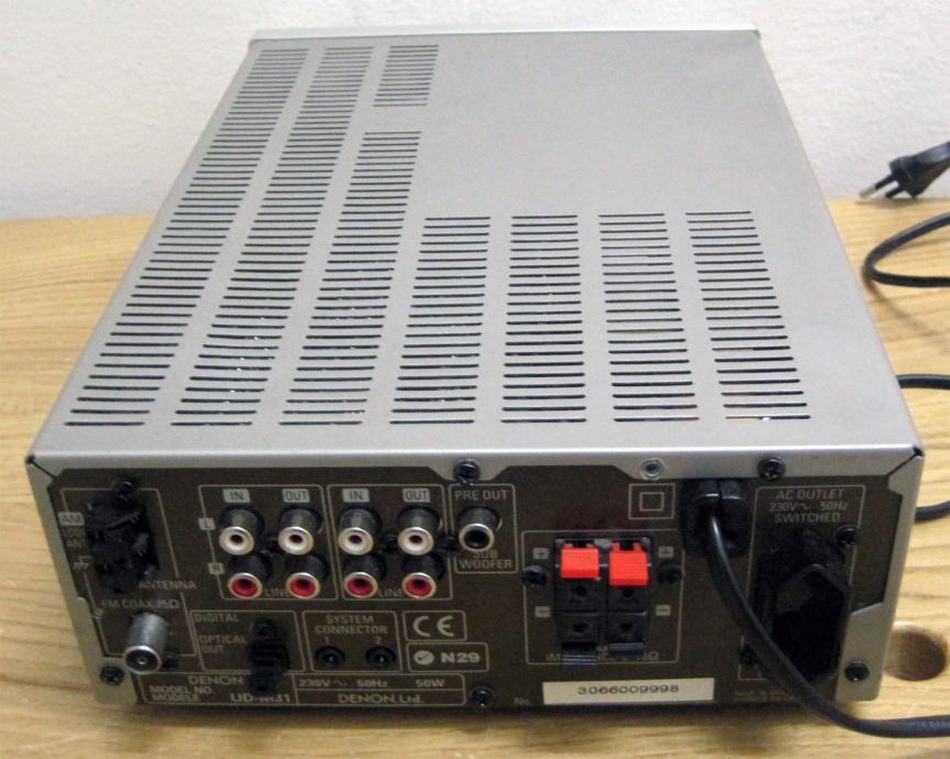 Lijepa mini-linija - Denon UD M-31. Uređaj je jako očuvan (stanje 9.5/10), ima daljinski, nedostaje originalna ambalaža (postoji zamjenska). Pojačalo je snage 22W, ima tonske kontrole (bass i treble), te postoji izlaz za subwoofer uz analogne ulaze i izlaze. Također postoji ulaz za slušalice na prednjem panelu uređaja