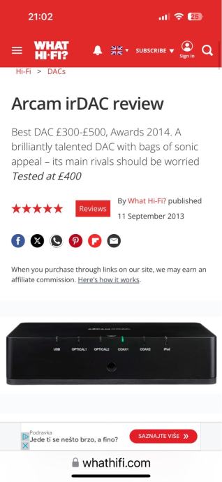Prodajem Arcam irDAC vrlo dobro očuvan, kupljen u Media Audio u ZG. Uz DAC ide daljinski, adapter, originalna kutija, uputstvo i račun.