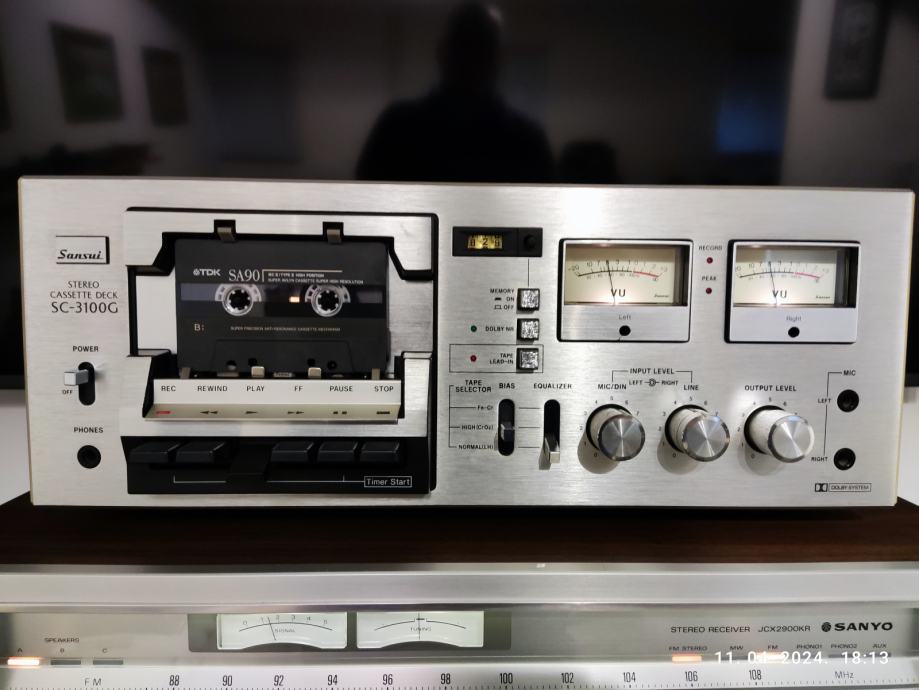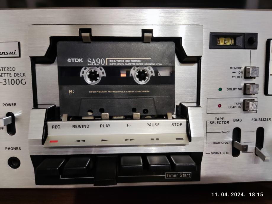 Prodaje se kazetofon Sansui SC-3100G u gotovo izvrsnom stanju (9,7/10) iz osobne kolekcije. U potpuno ispravnom stanju. Napravljen servis (promjena gumica i remena, čišćenje s DeoxIT i podmazivanje te podešavanje mehanike, provjera elektronike). Glave i pinchroller očišćeni s izopropilnim alkoholom. Kazetofon se može doći vidjeti i poslušati u Zagrebu. Servisni priručnik. Ne šaljem poštom ili dostavnim službama.