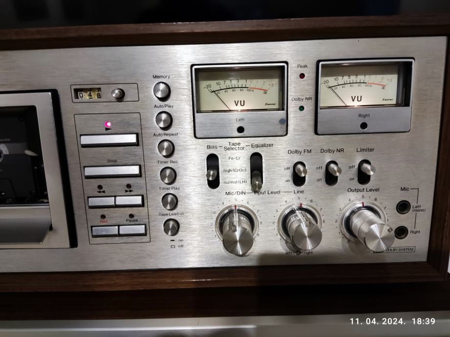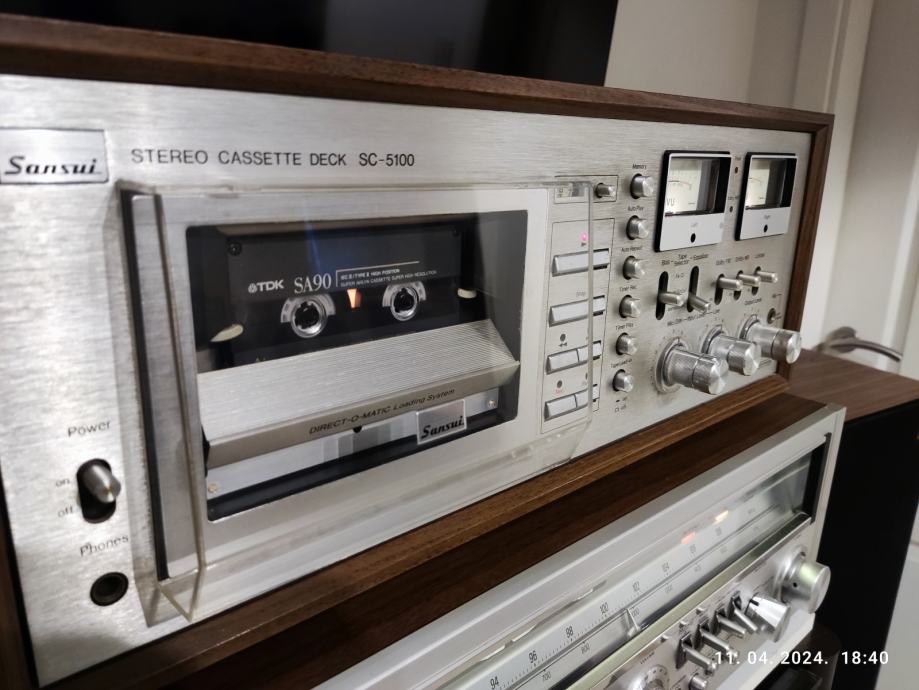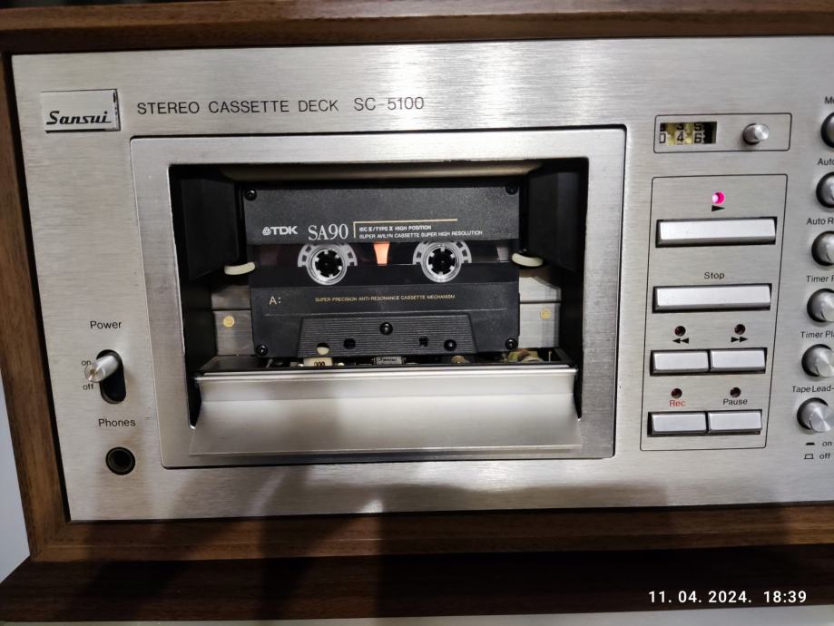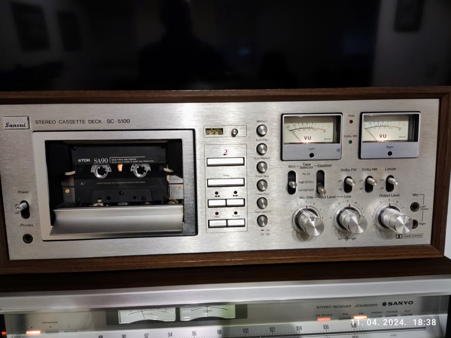 Prodajem potpuno ispravan hi-end vintage kazetofon Sansui SC-5100 u odličnom stanju (9/10) za svoje godine. Minimalni tragovi korištenja. Napravljen kompletan i kvalitetan servis, promijenjene gumice i remenje, novi idleri, kalibrirane i demagnetizirane glave, podešena i podmazana mehanika i VU-metri te očišćeni potenciometri. U kompletu s originalnom plastičnom zaštitom te priručnikom za servis (kopija). Cijene na europskom eBayu se kreće oko 1100 eura za ispravne primjerke. Kazetofon se može pogledati i poslušati u Zagrebu. Fotke su od kazetofona koji je na prodaju. Uz kazić dolaze servisni i korisnički priručnik. Ne šaljem poštom niti dostavnim službama.