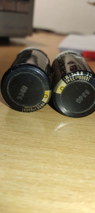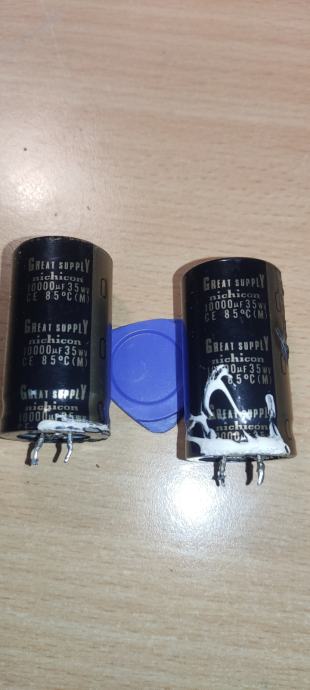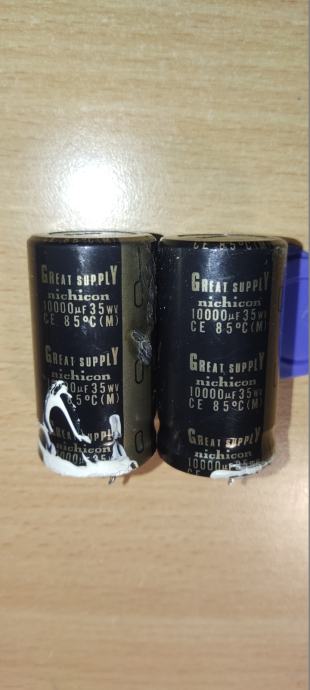 Dva uparena nichicon great supply kondenzatora, 10000uf/35 v, odlični za audio pojačalo, vrlo malo bili u upotrebi.