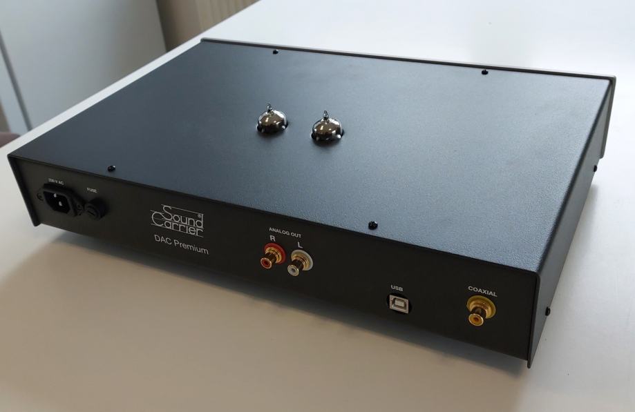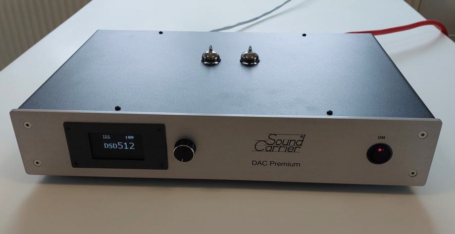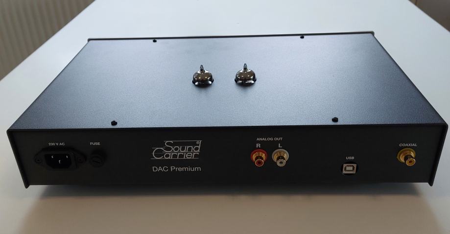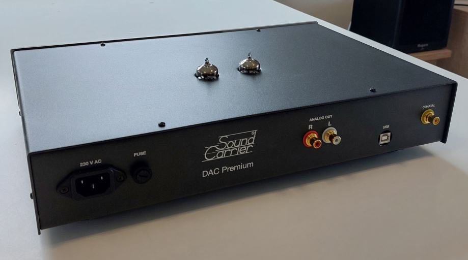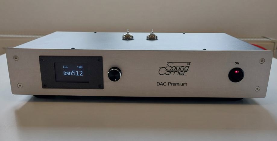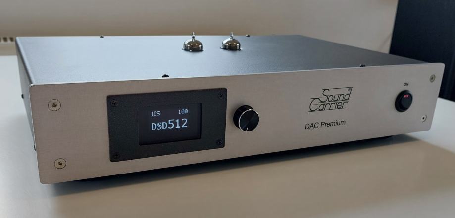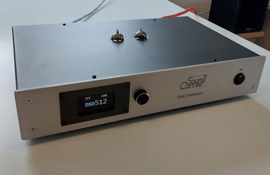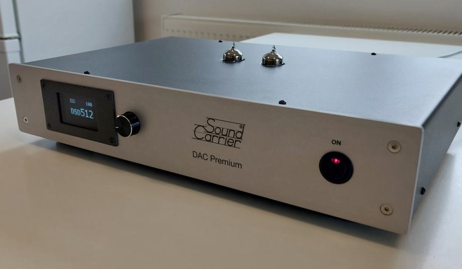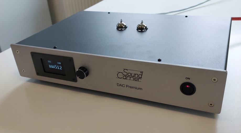 DAC Premium je najnoviji Sound Carrier DAC. Baziran je na chipu ESS ES 9038. Ima dva ulaza. SPDIF prihvaća PCM format do 24 bita / 192 kHz i DOP DSD 128. USB ulaz prihvaća PCM do 32 bita / 768 kHz i DSD 512, DOP i nativno. Za Windowse treba driver. Ima i volume control. Upravlja se encoderom, a izabrani ulaz, glasnoća i reproducirani format se pokazuju na displeju. Analogna sekcija je novorazvijena cijevna/MOSFET, sa stabiliziranim napajanjem. Upotrebljene elektronke su ECC 82 TAD, Premium Select. Uređaj predstavlja najjači Sound Carrier DAC u ovom trenutku. Cijena je 1135 €. Tel. 091/567-2703
