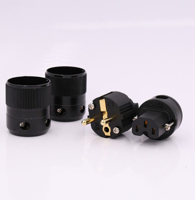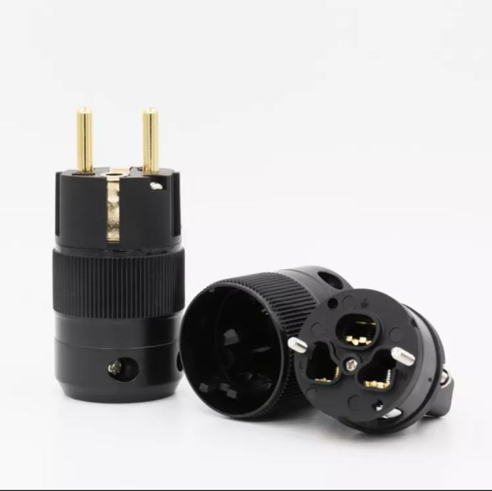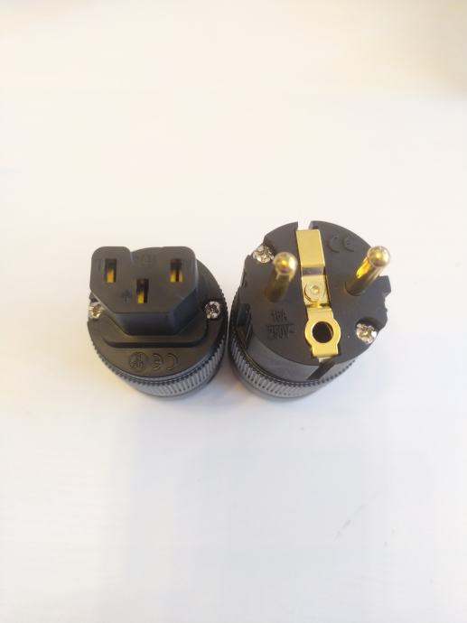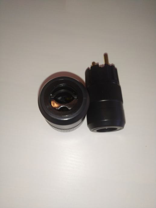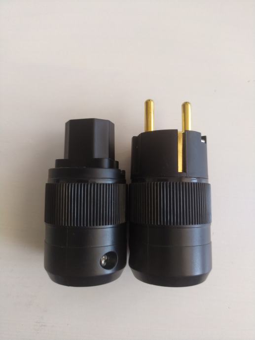 Prodajem kvalitetni strujni utikač (muški i ženski), za hifi strujni kabel debljine 6-18 mm. Pinovi 24 K pozlaćeni 99,96% OFC (oxygen free copper - čisti bakar), Cijena 50,00 kn/kom; 80,00 kn/par.