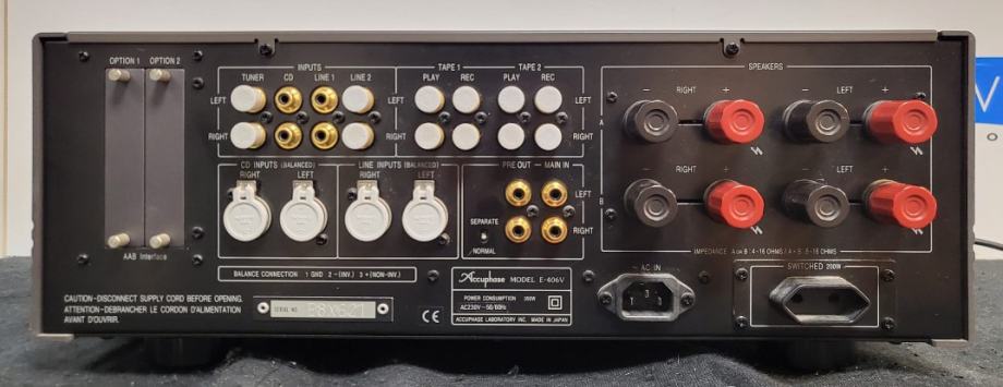 Ukupno osam ulaznih pozicija, uključujući dva balansirana ulaza, pružaju dobrodošlu fleksibilnost, uključujući dva opcionalna utora na stražnjoj strani pojačala za opcionalne ulazne ploče. Osim ulazne ploče linijske razine, Accuphase nudi analognu ulaznu ploču za disk za MM ili MC uloške, što omogućuje reprodukciju analognih ploča s izvanrednom zvučnom kvalitetom.