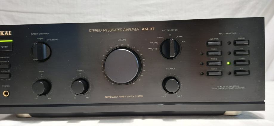 Akai AM-37 je klasično integrirano pojačalo iz ranih 90-ih (od 1992. do 1995. godine). To je uređaj koji utjelovljuje "zlatnu sredinu" Hi-Fi ere, nudi solidnu snagu, prepoznatljiv japanski dizajn i dugovječnost. Akai AM-37 je danas izvrstan izbor za nekoga tko ulazi u svijet Vintage Hi-Fi-ja. Robusno je građeno, ima "topao" zvuk i vizualno izgleda vrlo moćno s onim prepoznatljivim velikim potenciometrom za glasnoću. Kvaliteta zvuka AM-37 pojačala može se najbolje opisati kao neutralna, precizna i tipično "japanska" za to razdoblje. Ako volite analitičan, ali ugodan zvuk s puno detalja, AM-37 će vas jako ugodno iznenaditi. Nije pretjerano agresivno, ali nije ni "muljavo", drži se zlatne sredine koja godi većini slušatelja. Akai iz ove ere (serije AM) težio je visokoj vjernosti bez previše bojanja zvuka. Transparentnost zvuka je vrlo otvorena i pojačalo će vjerno prenijeti ono što je zapisano na mediju. Dinamičnost zvuka zahvaljujući solidnom transformatoru, AM-37 ima dobar "udarac" (punch) i nagli prijelazi u glazbi zvuče autoritativno i kontrolirano. U frekvencijskom rasponu visoki tonovi su čisti i detaljni, i pružaju onaj fini osjećaj prostornosti. Srednji tonovi su možda najjača strana ovog pojačala. Vokali su prirodni, smješteni točno u sredinu zvučne slike i imaju dobru teksturu. Bas je čvrst i definiran, ali nije "napumpan". Akai ne pokušava umjetno pojačati niske frekvencije; dobit ćete točno onoliko basa koliko vaši zvučnici mogu pružiti. Zvučna pozornica kod AM-37 prilično dobro disperzirana u prostoru. Ako su zvučnici dobro postavljeni, može se jasno razaznati gdje se koji instrument nalazi. Uređaj je stručno pregledan, potpuno ispravan i funkcionalan, a vizualno se vide sitni tragovi korištenja na zadnje 4 slike. U kompletu sa Akai AT-52 tunerom prodaje se za 120e.