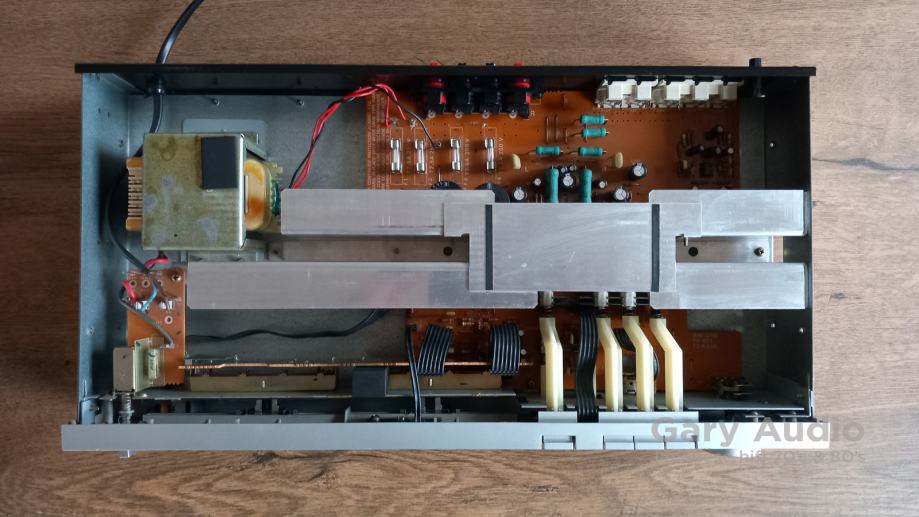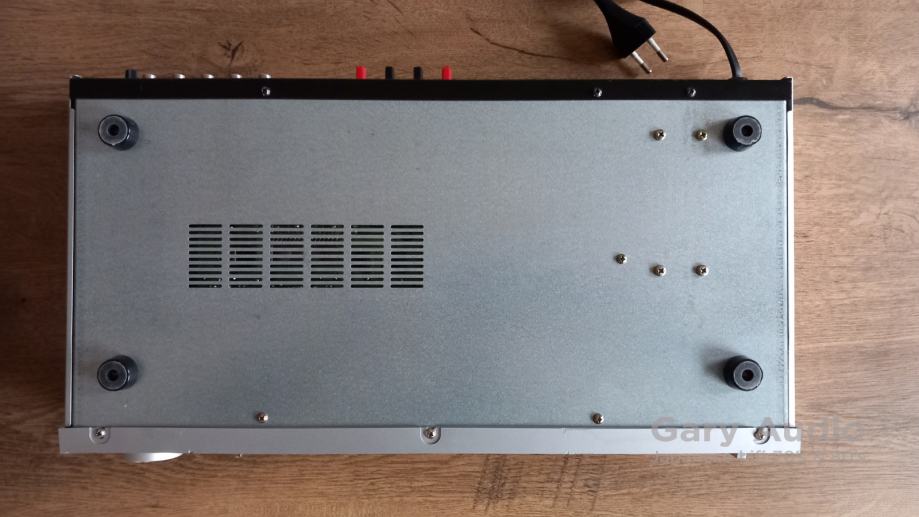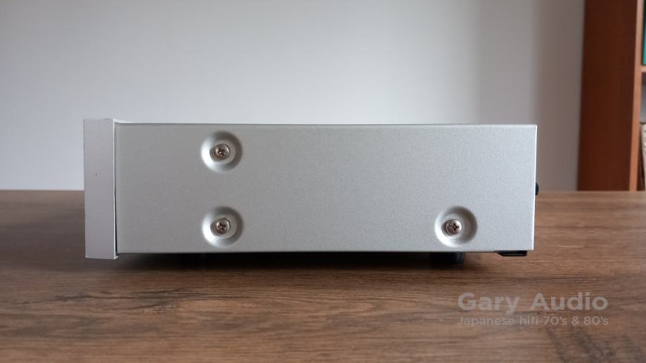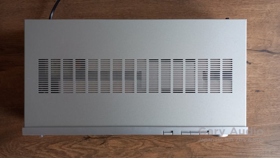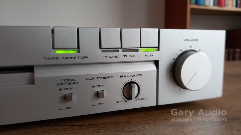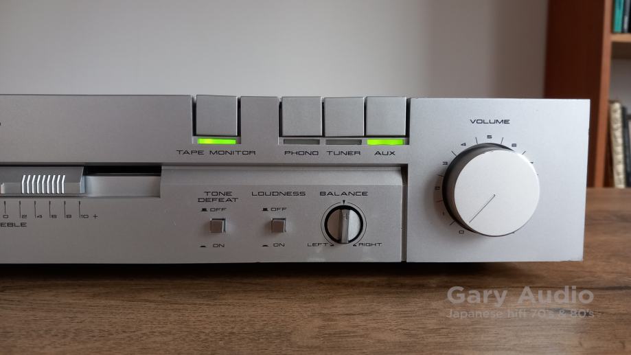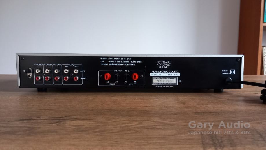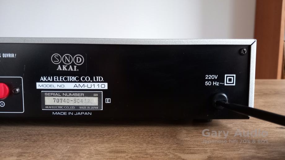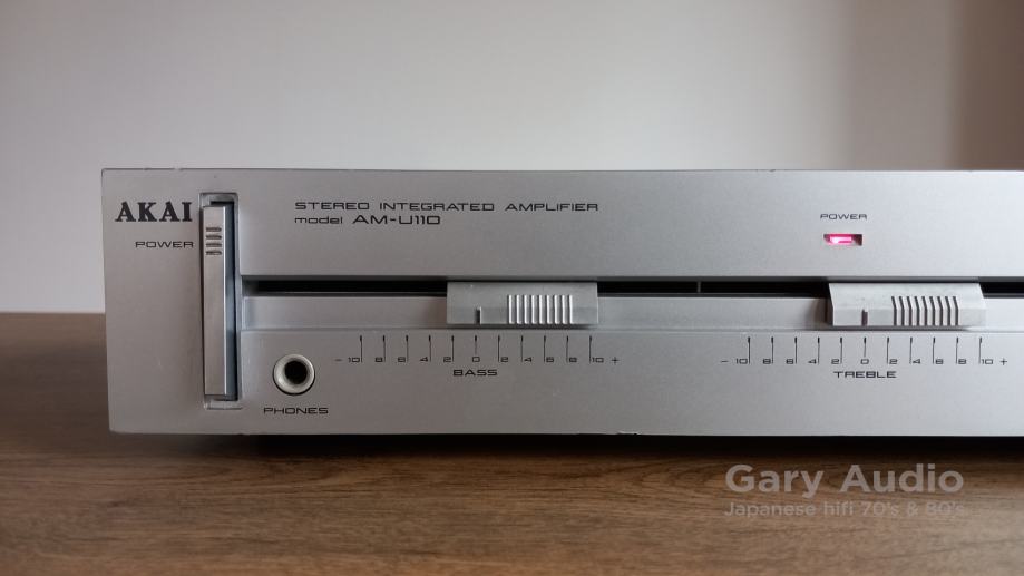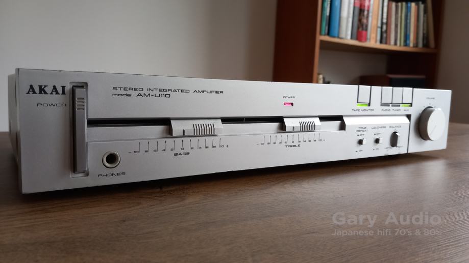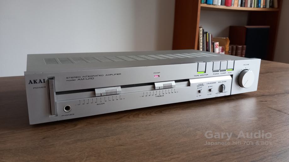 Akai model AM-U110 Stereo integrirano pojačalo. Pojednostavljeni dizajn s početka 1980-ih, zelena LED svjetla na srebrnoj prednjoj strani. Horizontalni EQ potenciometri. Bogat zvuk, širok frekvencijski odziv i niska distorzija. Očišćeno, testirano, potpuno funkcionalno.
