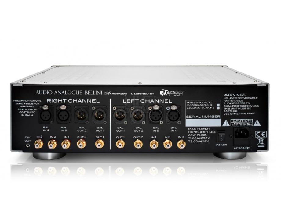 Bellini Anniversary pretpojačalo, dizajnirano u Airtech laboratorijima, dio je Anniversary linije, ponovno predlažući još jedan od povijesnih proizvoda Audio Analoguea. Jedina zajednička stvar između ovog novog modela i prethodnih verzija Bellini ostaje ime, dok su projekt i tehnička rješenja koja su korištena potpuno novi. Počevši od izvrsne baze koju čini dio pretpojačala integriranog pojačala Maestro Anniversary, noviteti u odnosu na potonje su ipak višestruki. Prvi je stupanj napajanja koji je potpuno redizajniran korištenjem induktivno-kapacitivnog filtriranja kako bi se smetnje u mreži svele na minimum. Induktivitet filtra dizajniran je i proizveden posebno za ovaj uređaj. Stupanj pojačanja, nazvan SeGeSTA (Single Gain Stage Transconductance Amplifier), dizajniran je da pretpojačalo učini još tišim dok struktura ostaje potpuno uravnotežena i bez globalne povratne sprege. Krug ima 4 sloja, a pozicioniranje komponenti pažljivo je osmišljeno kako bi se izbjeglo križanje između ulaznih i izlaznih signala i iznad svega između digitalnih kontrolnih signala i osjetljivih analognih signala. Korištenje audiograde komponenti i unutarnje ožičenje izrađeno od 7N OCC kabela od čistog bakra upotpunjuju sliku.