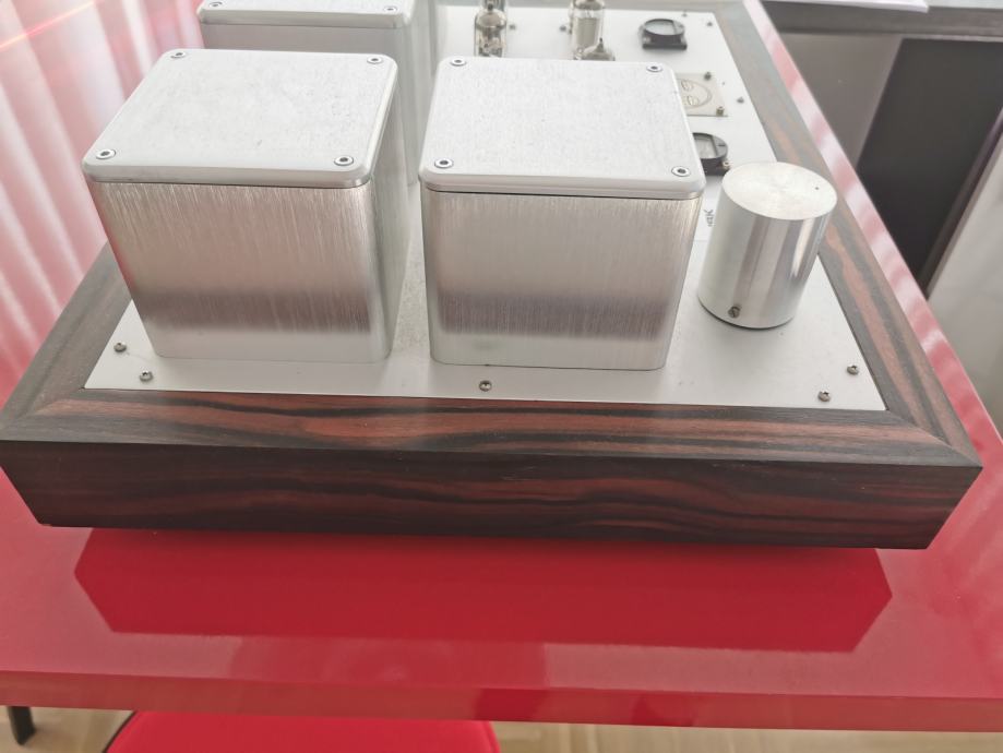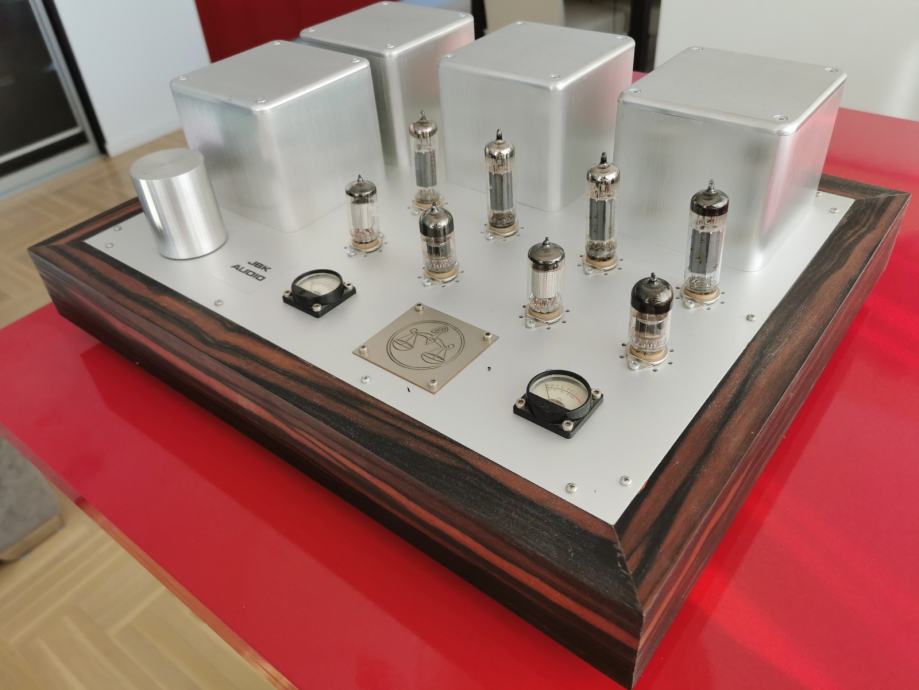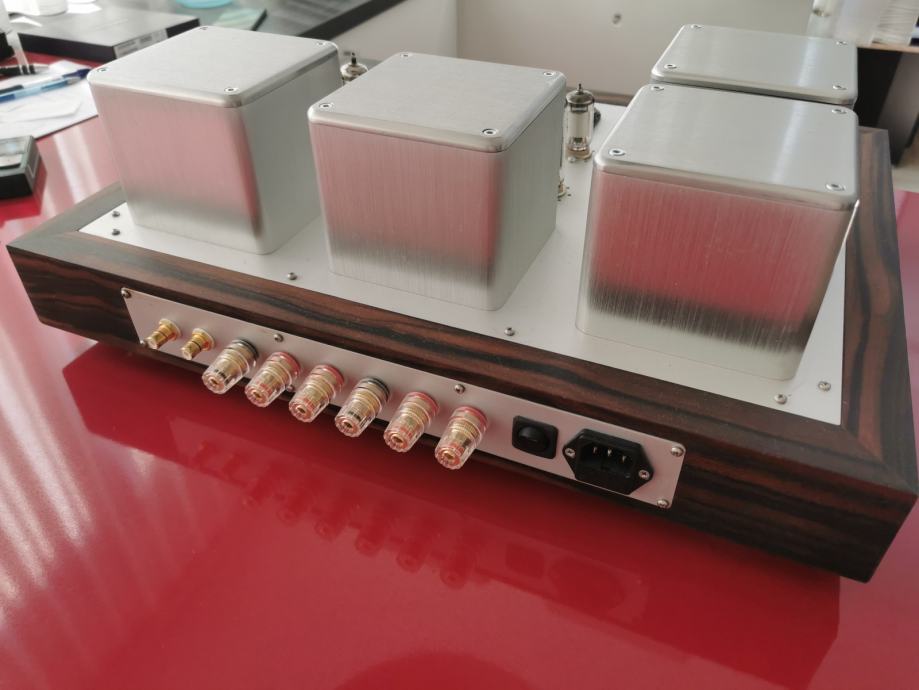 Poznata Philipsova konstrukcija 2 x 12 W s 2 x EL84 u izlazu. Ispred EF86 i ECC83. Drveni okvir, aluminijske ploče. Pojačalo rađeno za sebe najbolje što je moglo. Svaki kanal svoj napajački trafo, dakle nije zajednički napajački trafo. Straga predviđeno spajanje i 4 i 8 ohma, ali 4 ohma nije spojeno. VU metri nisu spojeni.