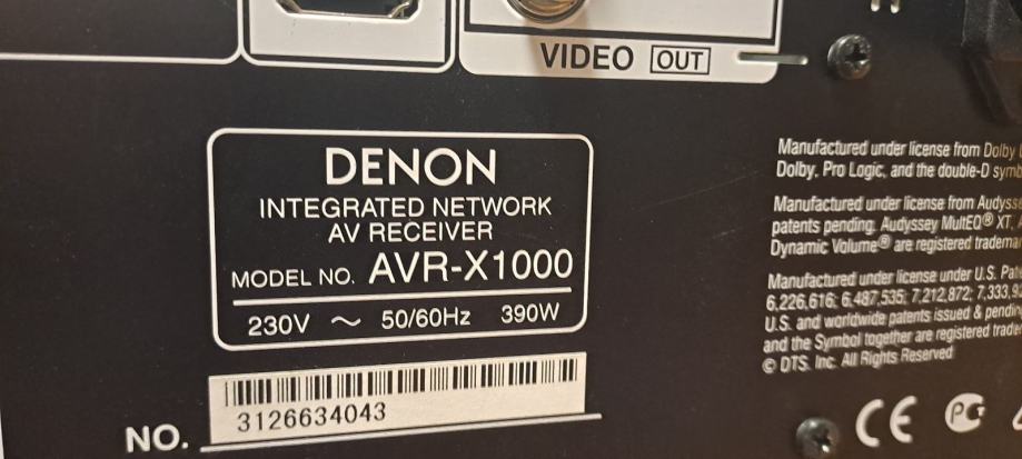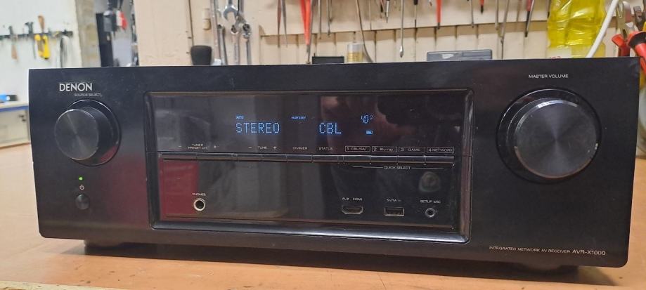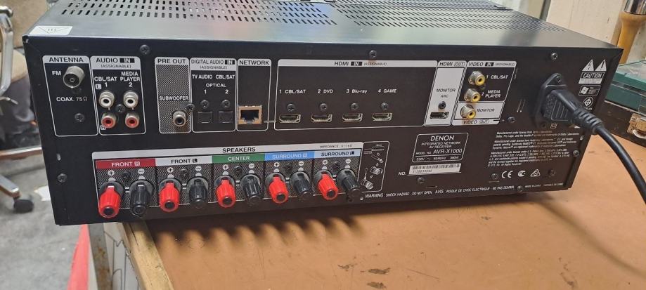 Prodajem Denon AVR-X1000 integrirani mrežni AV receiver. Radi se o kompaktnom 5.1 kanalom receiveru koji podržava više HDMI ulaza i izlaza, digitalne optičke i koaksijalne priključke, kao i mrežnu vezu. Na stražnjoj ploči nalaze se priključci za antenu, zvučnike (prednji, centralni i subwoofer), te brojne audio i video ulaze.